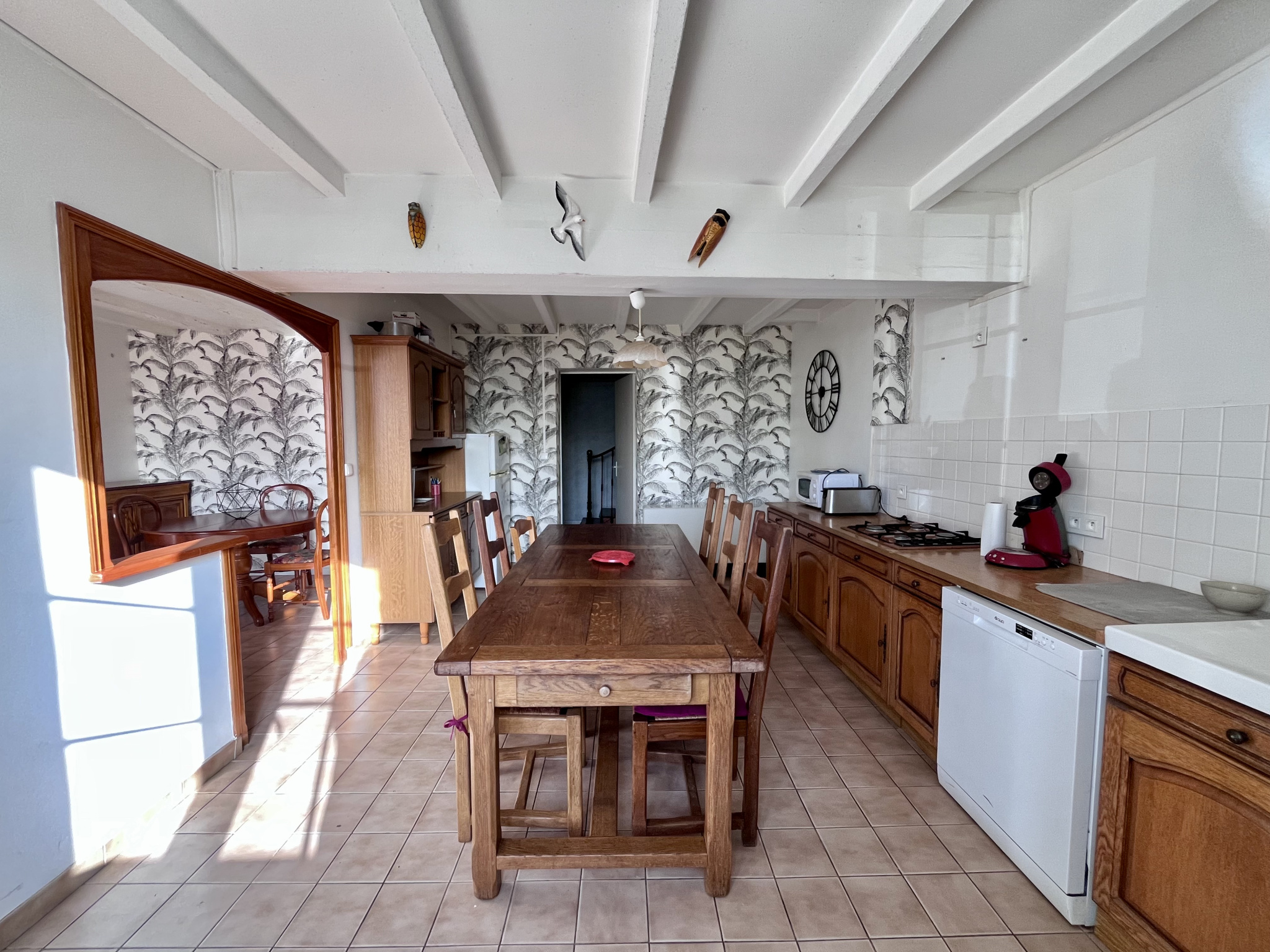D'une superficie totale de 104 m2, répartie sur 2 niveaux, elle comprend au rez-de-chaussée : une cuisine / salle à manger de 18,25 m2, un salon de 15,35 m2 (les 2 pièces pouvant être très facilement rassemblées pour créer une plus grande pièce de vie). Un palier de 13,50 m2 dessert un cellier / buanderie de 10,60 m2 donnant accès au jardin et au garage, ainsi qu'un WC indépendant. L'étage, accessible par un large escalier en bois, débute par un palier et donne suite à 2 spacieuses chambres avec vue sur le port de 14,30 et 19,70 m2, une salle d'eau rénovée de 4,35 m2 ainsi qu'un WC indépendant. Un grenier non aménagé et isolé d'environ 45 m2 (pouvant être aménageable). Pour accompagner le tout, un garage accessible par la route d'environ 25 m2. Les menuiseries sont en simple vitrage et survitrage, et le chauffage est électrique par bain d'huile. L'assainissement, quant à lui, est relié au tout-à-l'égout.