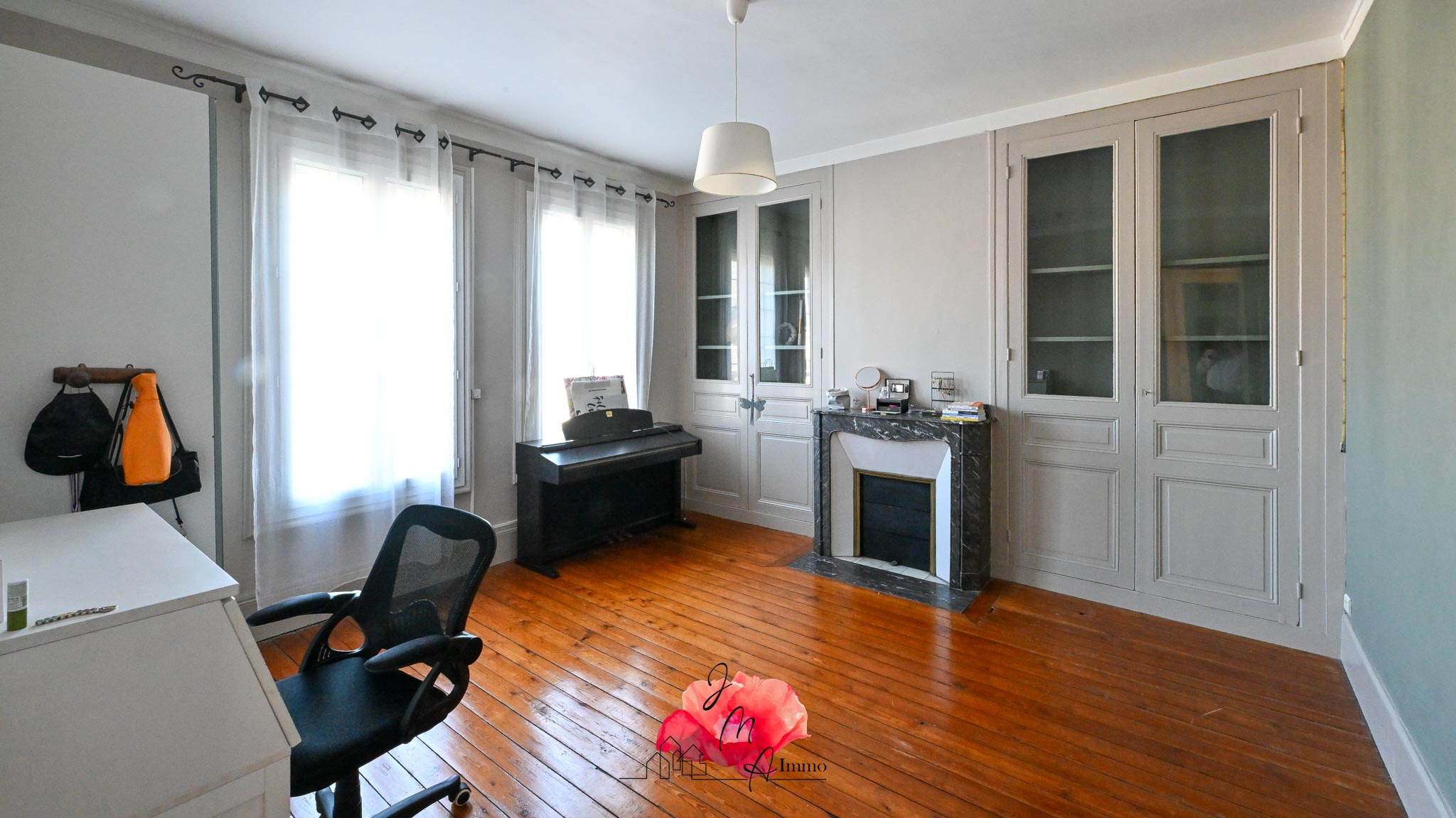 Au rez-de-chaussée :Une vaste et élégante entrée dessert un bureau, un lumineux séjour/salon parqueté, une cuisine indépendante et un WC.