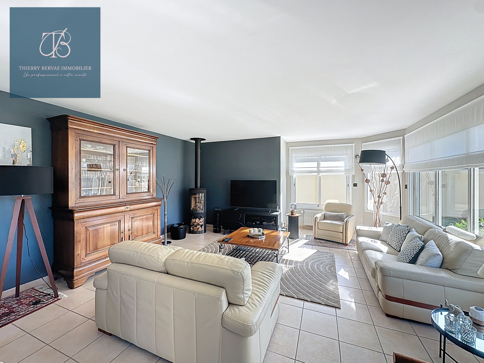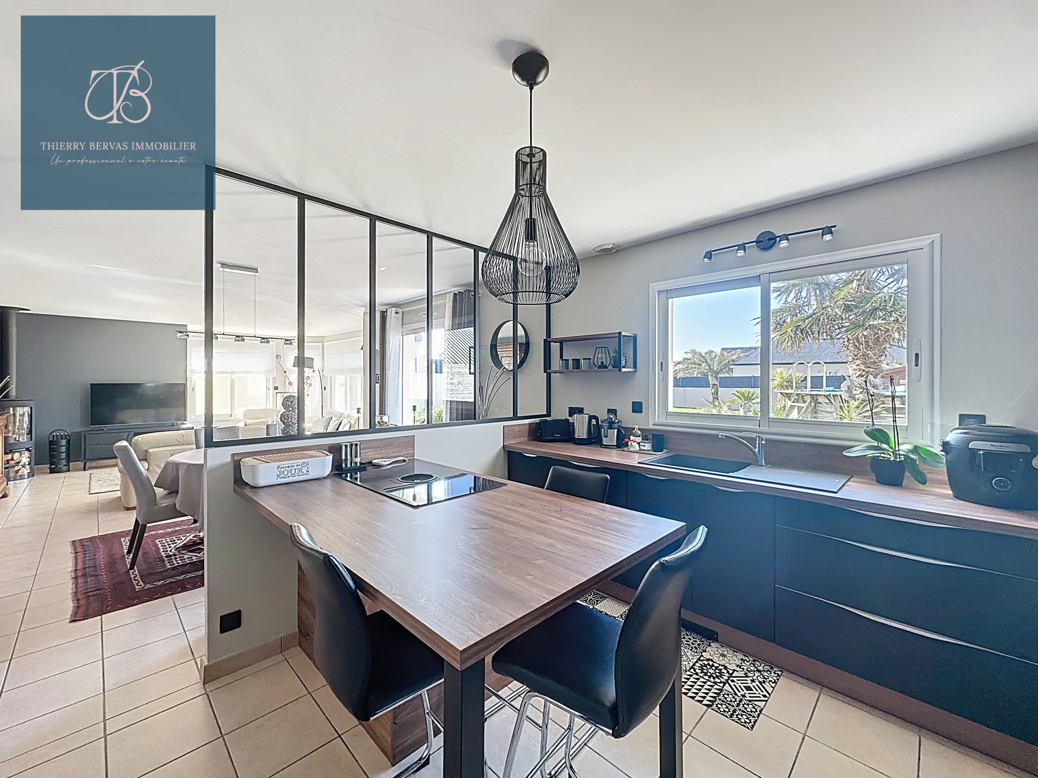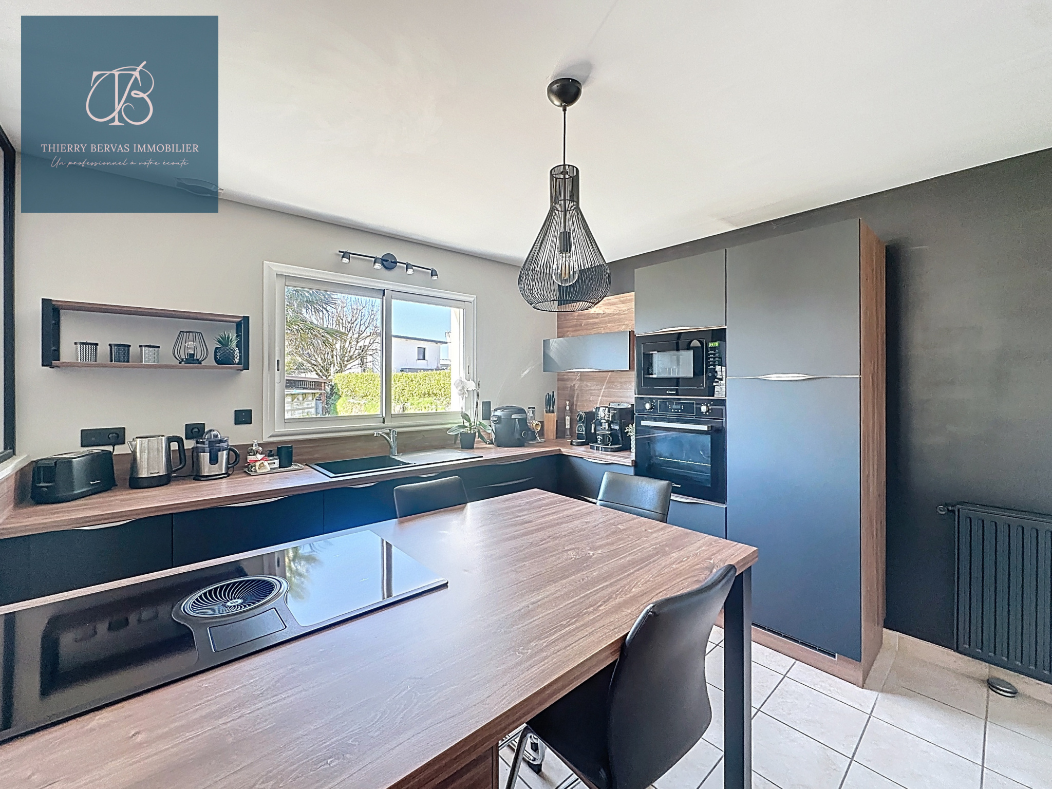 Dès le hall d'entrée, vous serez séduit par la distribution fluide des espaces. Le rez-de-chaussée accueille une chambre avec salle d'eau privative, idéale pour recevoir ou pour une suite parentale de plain-pied. Le vaste salon-séjour, généreusement ouvert sur l'extérieur et baigné de lumière naturelle, est sublimé par un poêle à bois qui confère chaleur et élégance à l'ensemble. La cuisine aménagée et entièrement équipée, agrémentée d'un îlot central, est séparée par une verrière contemporaine qui structure l'espace avec raffinement. Un WC indépendant et un accès direct au garage complètent ce niveau.
