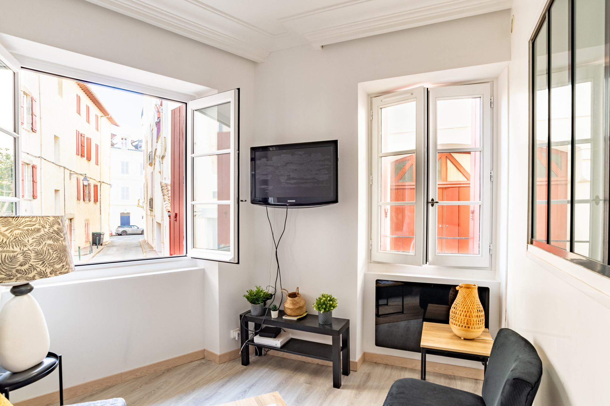 Dans résidence historique du centre de Saint Jean de Luz et à proximité de tout : commerces, restaurants, bus et gare à pied , très bel appartement de type 1 bis (chambre séparée) refait à neuf bénéficiant de belles prestations : cuisine équipée, double vitrage, visiophone, fibre.