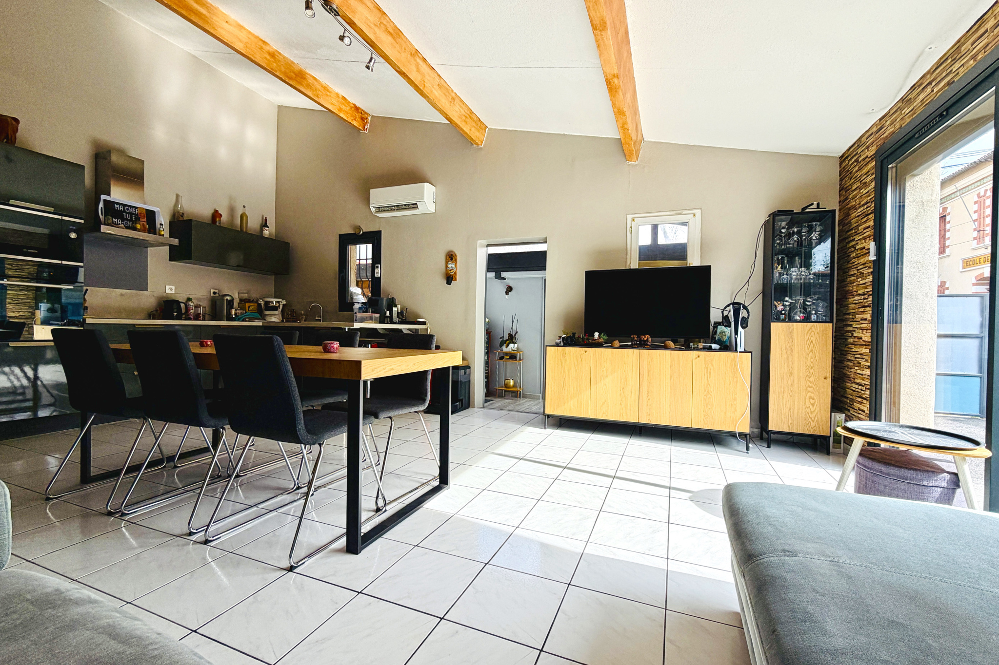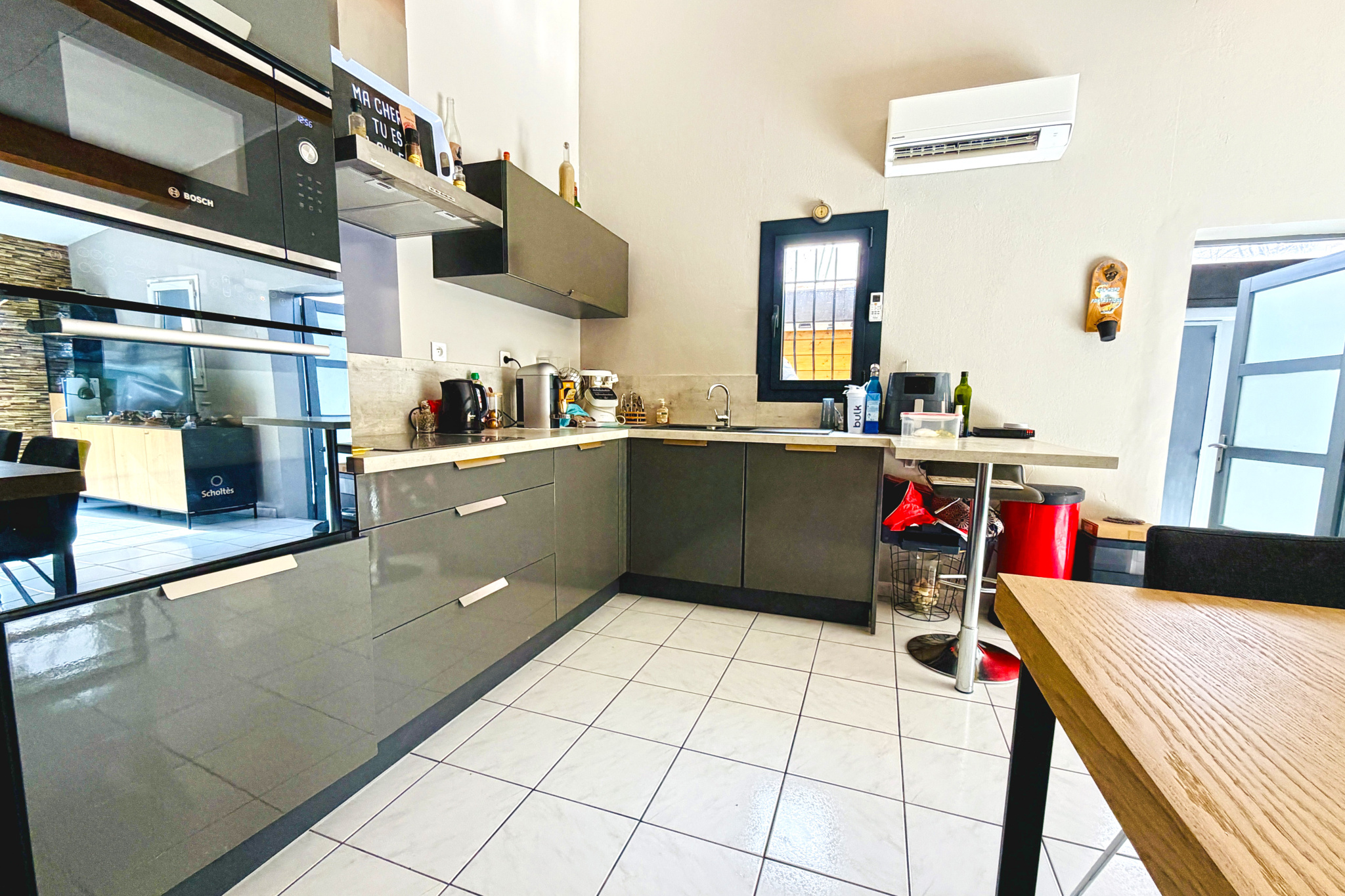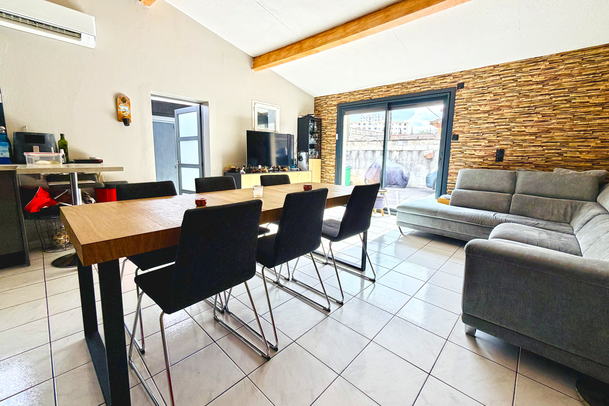 Grande pièce de vie avec cuisine ouverte entièrement équipée, idéale pour recevoir