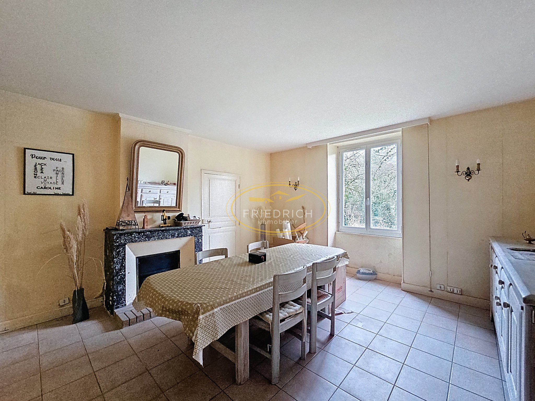 - Salle à manger (20m2) : sol carrelage, placard encastré, cheminée en marbre, fenêtre ;