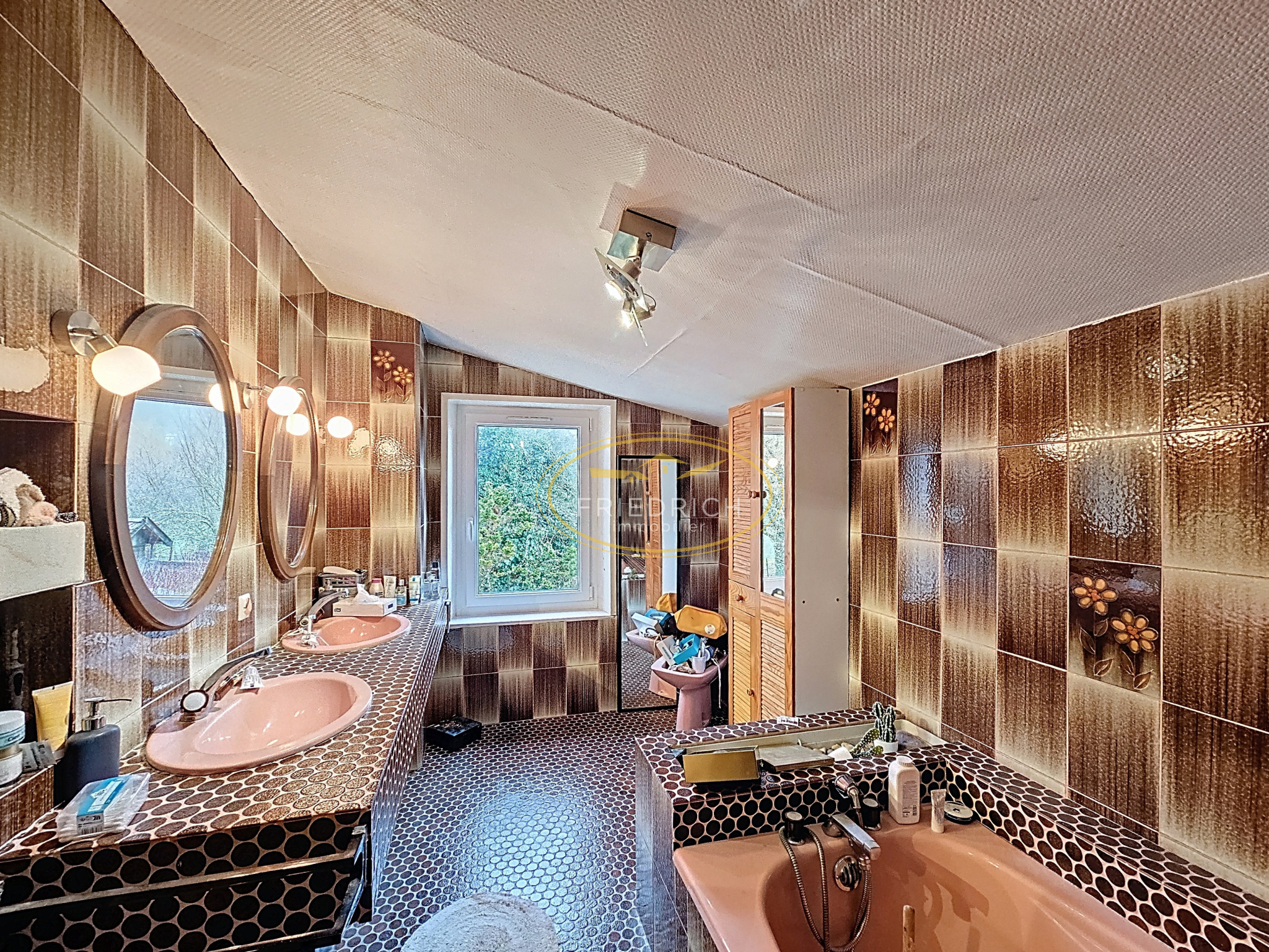 - Salle de bain (8,37m2) : sol carrelage, double vasques sur meuble, baignoire, bidet, fenêtre ;