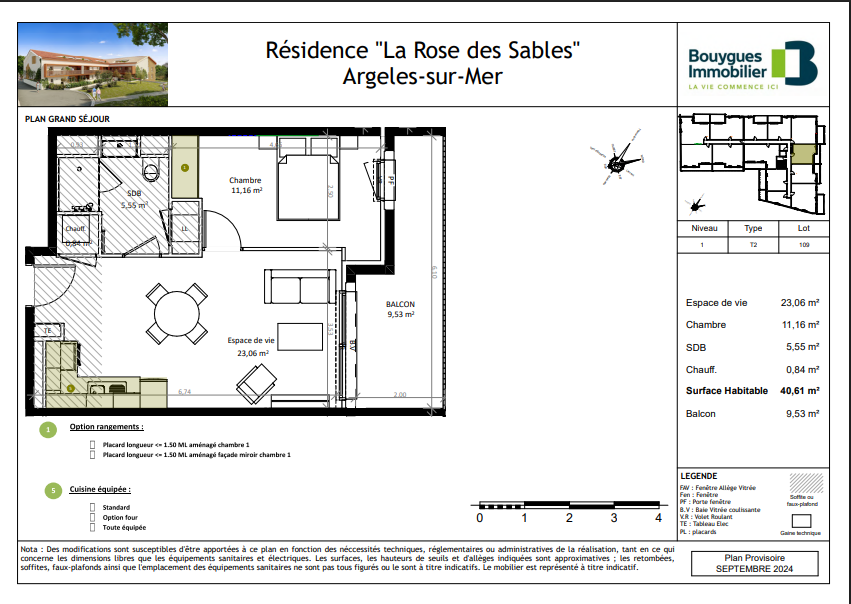 ARGELES-SUR-MER : L'Agence LAVILLE IMMO vous présente, au coeur d'un environnement naturel et préservé, ce superbe appartement neuf 2 pièces situé dans la résidence 'La Rose des Sables' à Argelès-sur-Mer. À seulement 10 minutes des plages à vélo et à proximité immédiate du centre-ville, profitez d'un cadre de vie unique entre mer et montagne, dans une résidence intimiste et sécurisée. Ce logement lumineux de 40,61 m2 habitables se compose d'un bel espace de vie de 23 m2 avec cuisine semi-équipée ouverte sur le séjour, donnant accès à un balcon de 9,53 m2, idéal pour profiter du climat méditerranéen. L'espace nuit offre une chambre confortable de 11 m2 avec possibilité de placard aménagé, ainsi qu'une salle d'eau moderne avec grande douche (90x120 cm) et WC. Bien soumis au régime de la copropriété.Nombre de lots : 17.