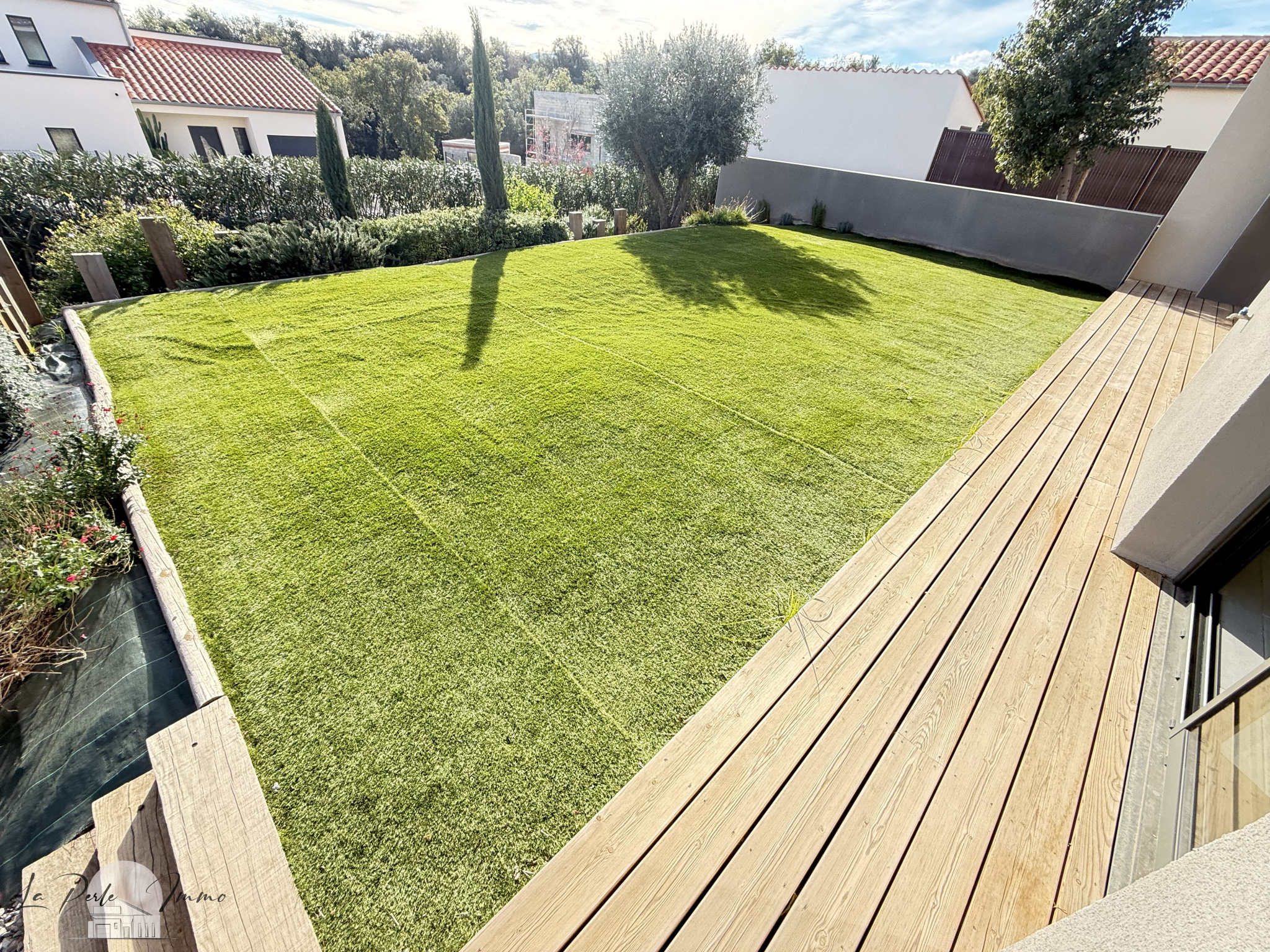 Un accès direct à une terrasse en bois exotique de 25 m2, prolongeant naturellement la pièce de vie vers le jardin,