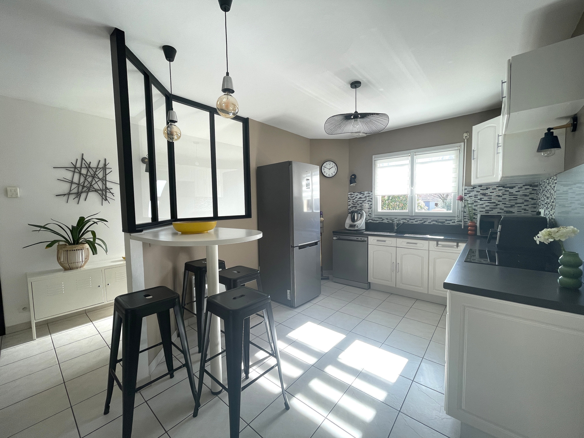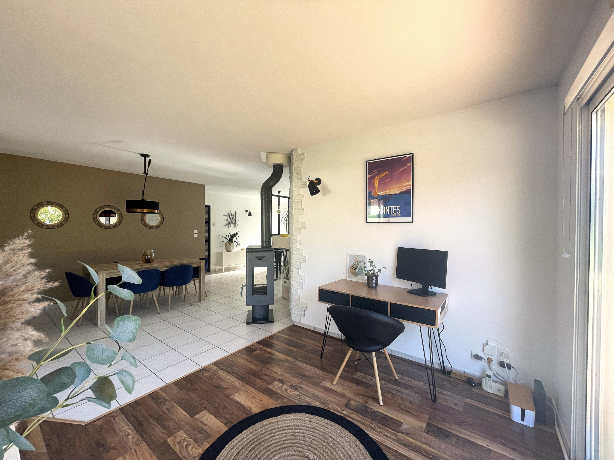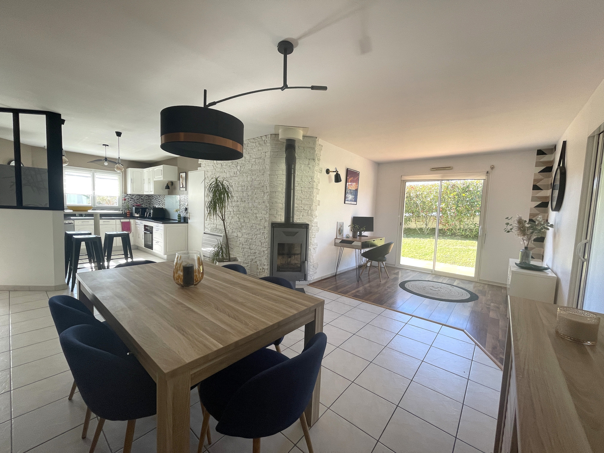 une entrée avec verrière, un bel espace de vie poêle à bois central, espace cuisine aménagée et équipée, dégagements, placards, 3 chambres avec placards, une salle de bains récente (douche et baignoire), un WC avec lave-mains.