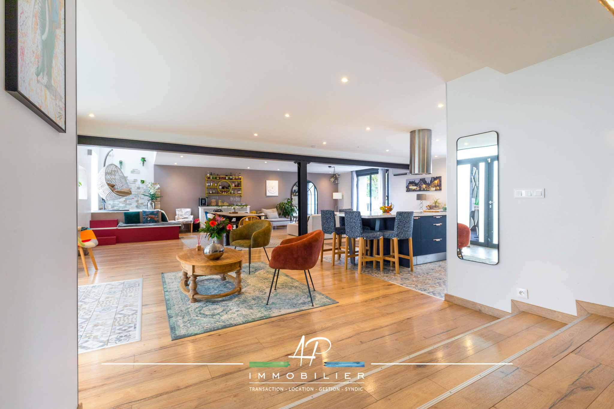 À l'étage, une mezzanine distribue trois chambres ainsi qu'une salle de bains confortable avec baignoire et douche. La suite parentale bénéficie de son propre dressing et d'une salle d'eau à finaliser, offrant un potentiel d'aménagement personnalisé selon vos envies.