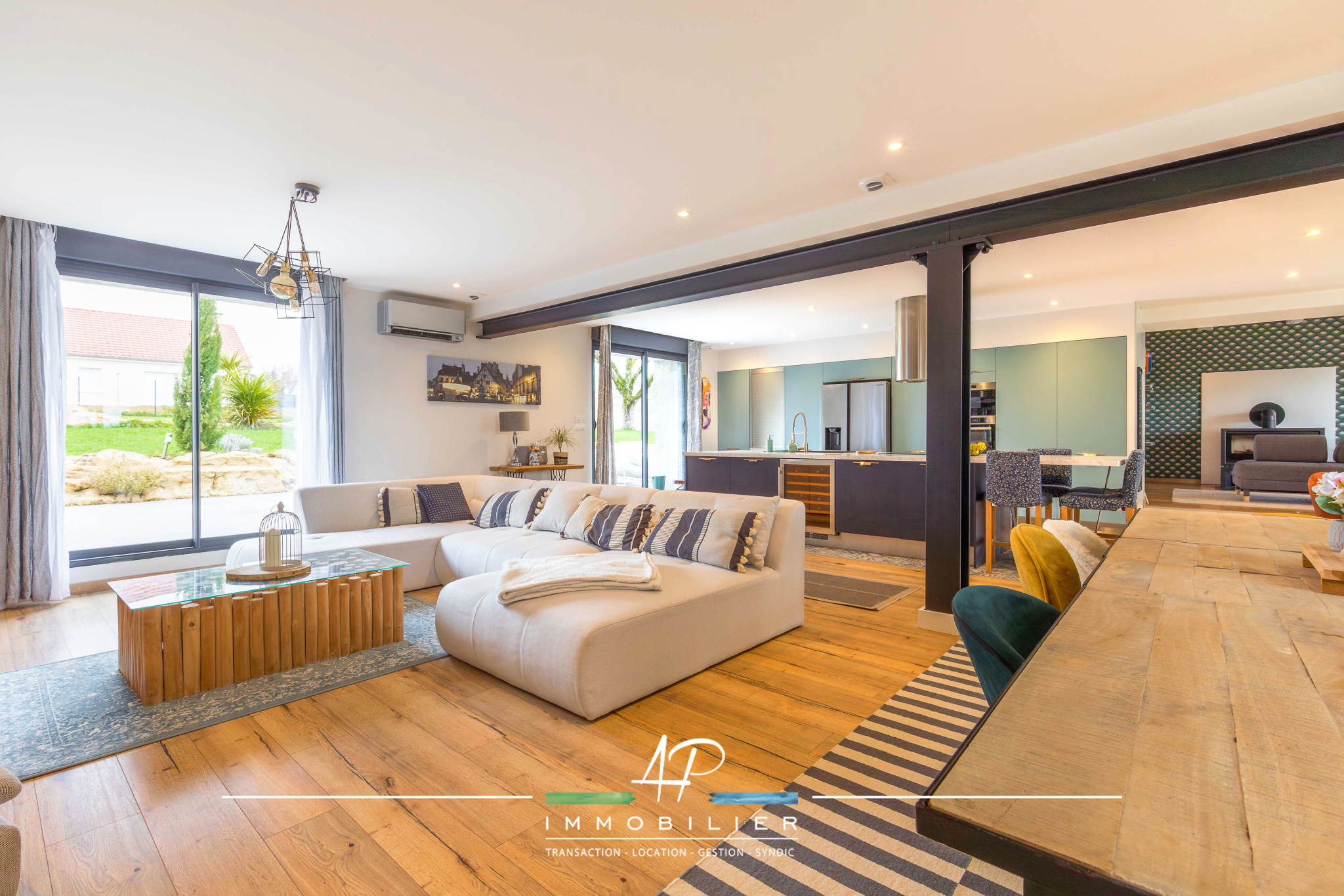 Au rez-de-chaussée, la pièce de vie de plus de 100m2 avec cuisine ouverte équipée constitue le véritable coeur de la maison. Deux salons, dont l'un agrémenté d'un poêle à bois, permettent de créer des ambiances distinctes, entre réception et espace plus intimiste. Une chambre, une buanderie, un wc et une salle de bains en cours d'achèvement complètent ce niveau.