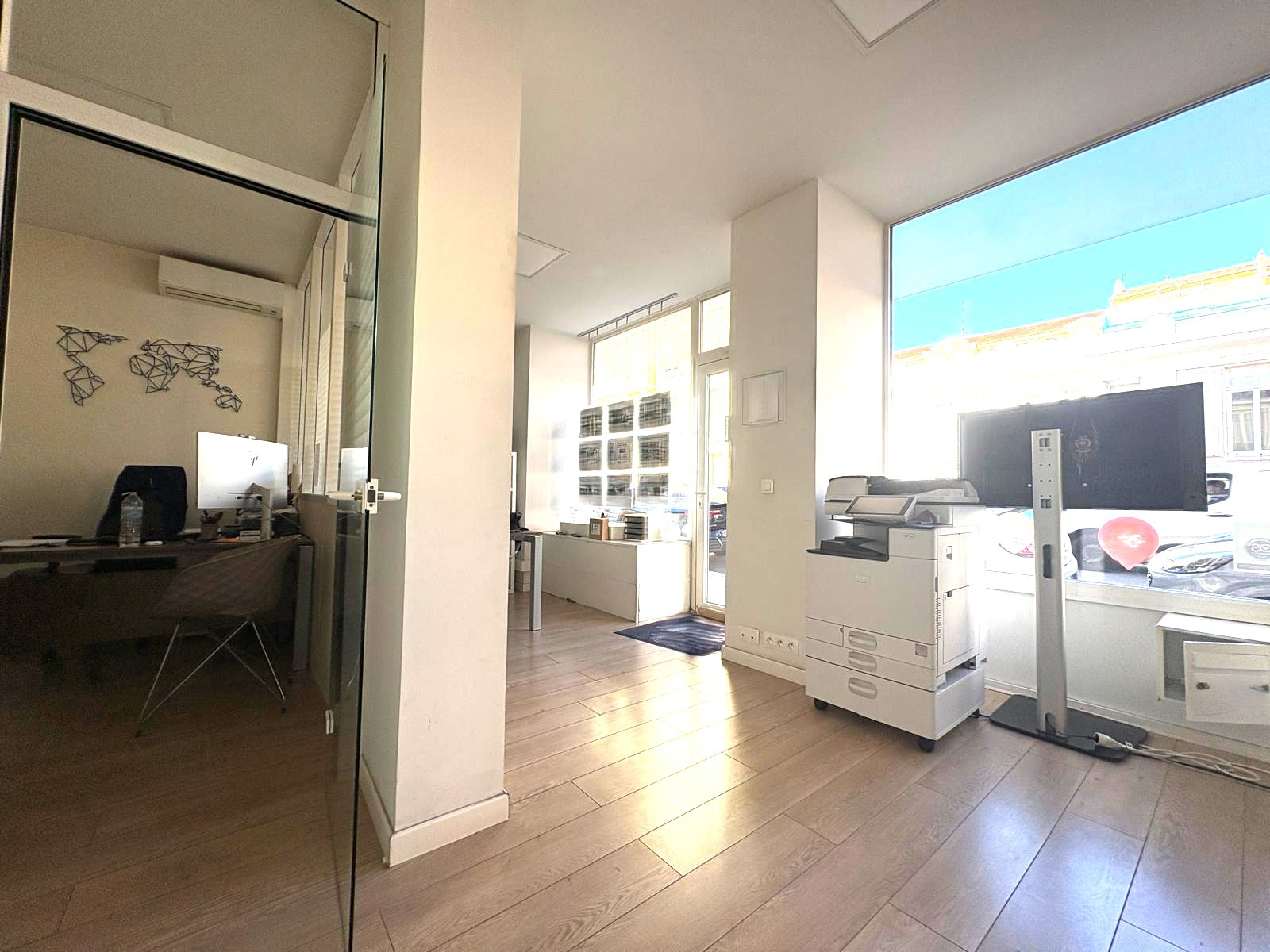 Actuellement composé d'un poste d'accueil, de 2 postes de travail en open space, d'un bureau privatif fermé ainsi que de sanitaires (lavabo et WC), le local est proposé libre de toute occupation et de bail en cours. Toutes activités commerciales autorisées (hors restauration avec extraction).