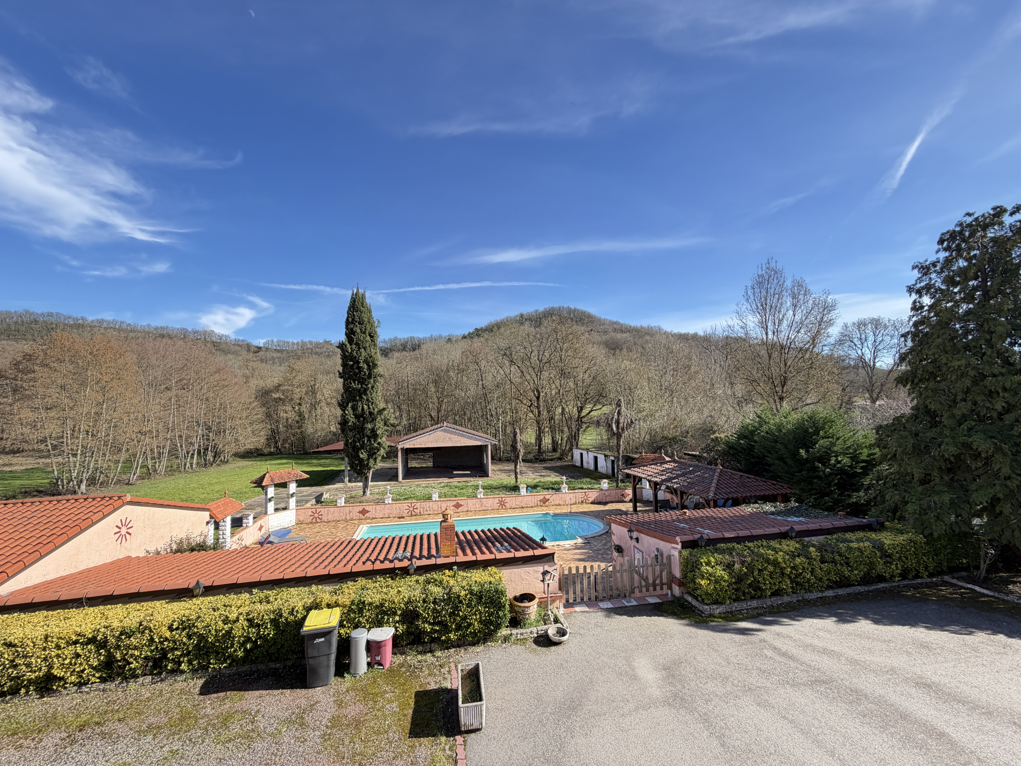 Les extérieurs offrent un cadre privilégié avec une piscine traditionnelle de 10 x 5 m au chlore, dotée d'un liner récent, un pool house avec cuisine d'été, salle d'eau et WC, ainsi qu'un vaste parc arboré. La propriété dispose également de garages et hangars permettant le stationnement de plusieurs véhicules, ainsi que de nombreuses dépendances, ateliers et locaux techniques.