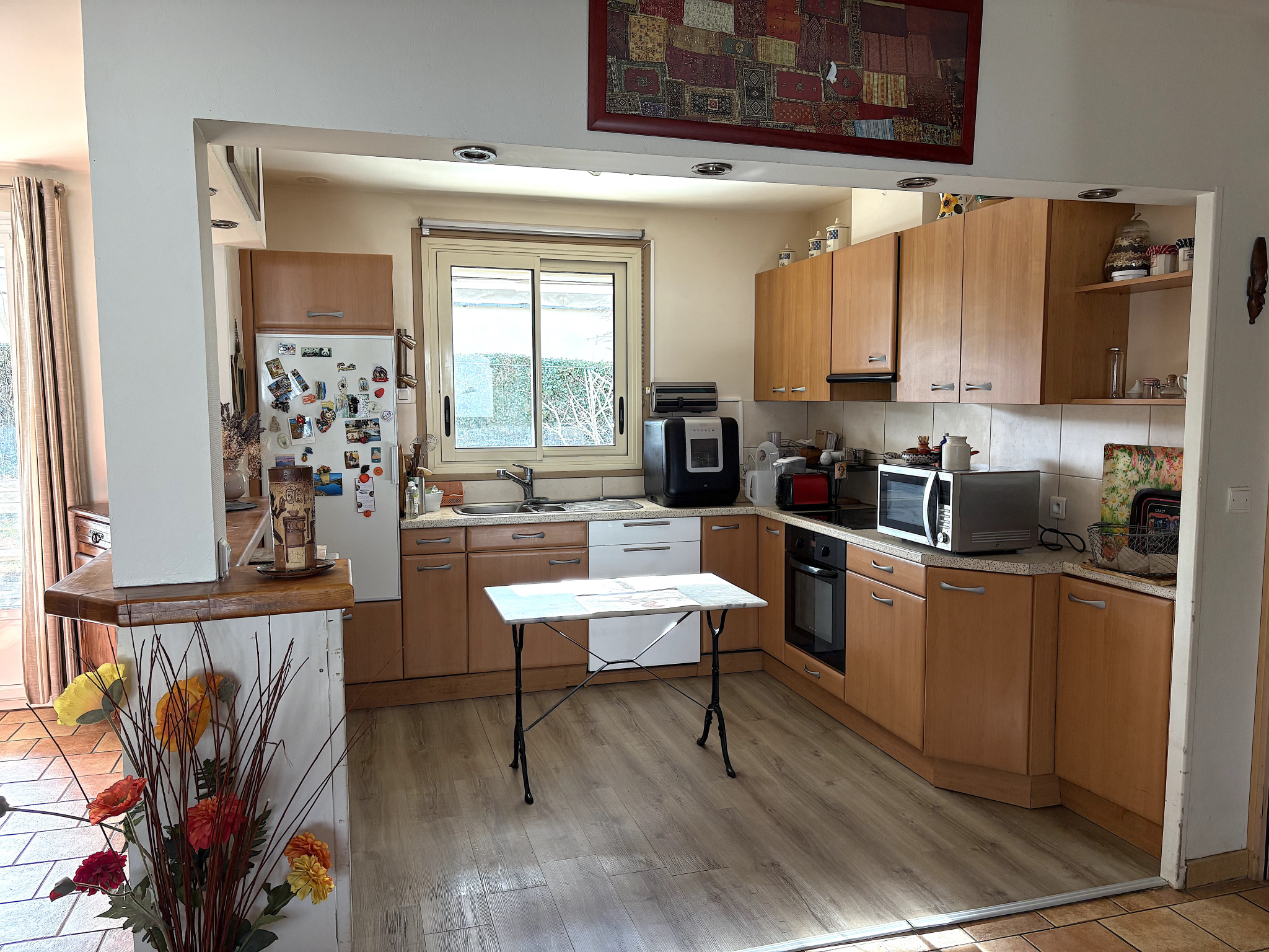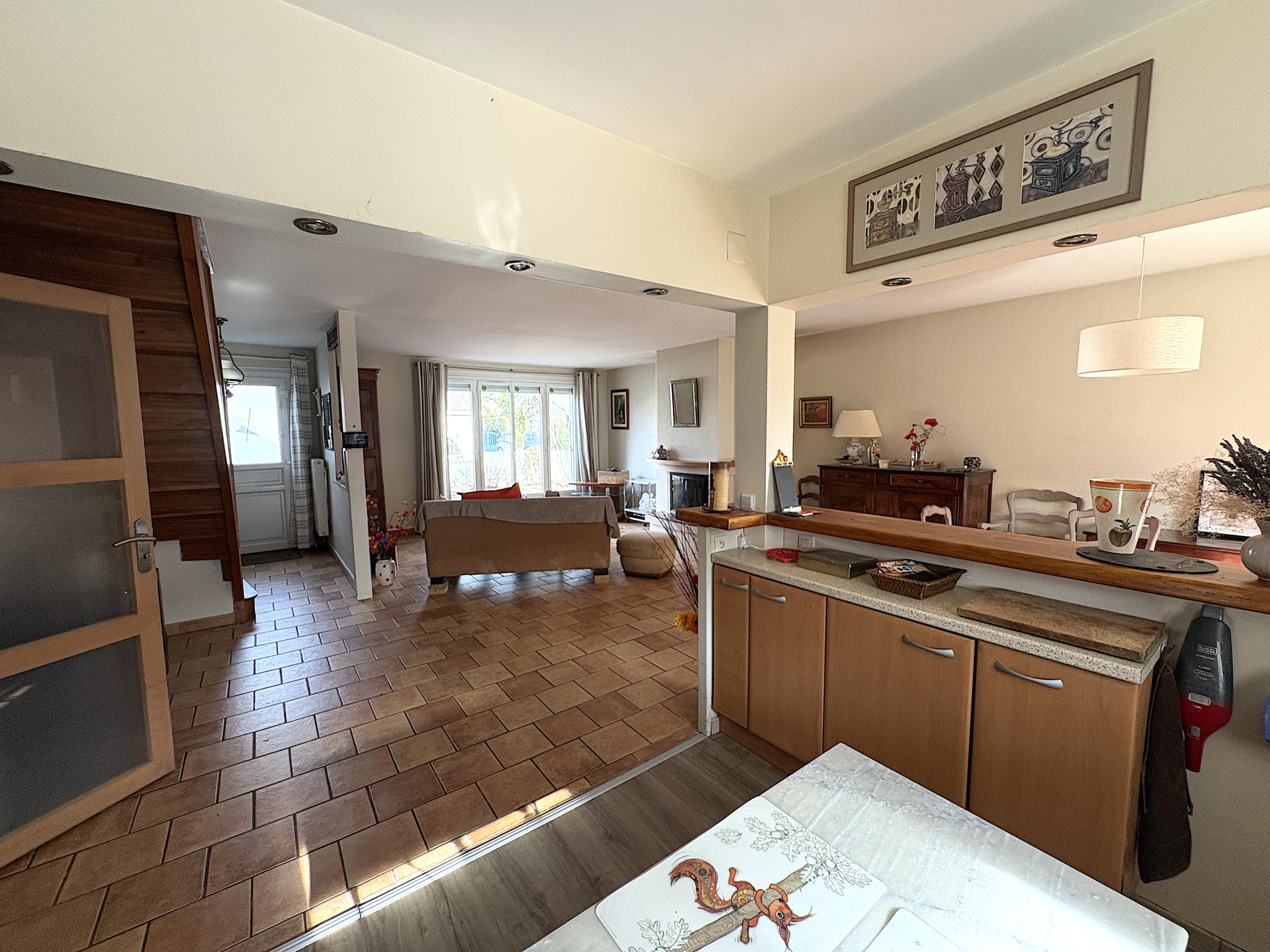 Dès l'entrée, vous découvrez une pièce de vie lumineuse comprenant un salon-séjour avec cheminée insert et une cuisine ouverte, favorisant convivialité et partage.