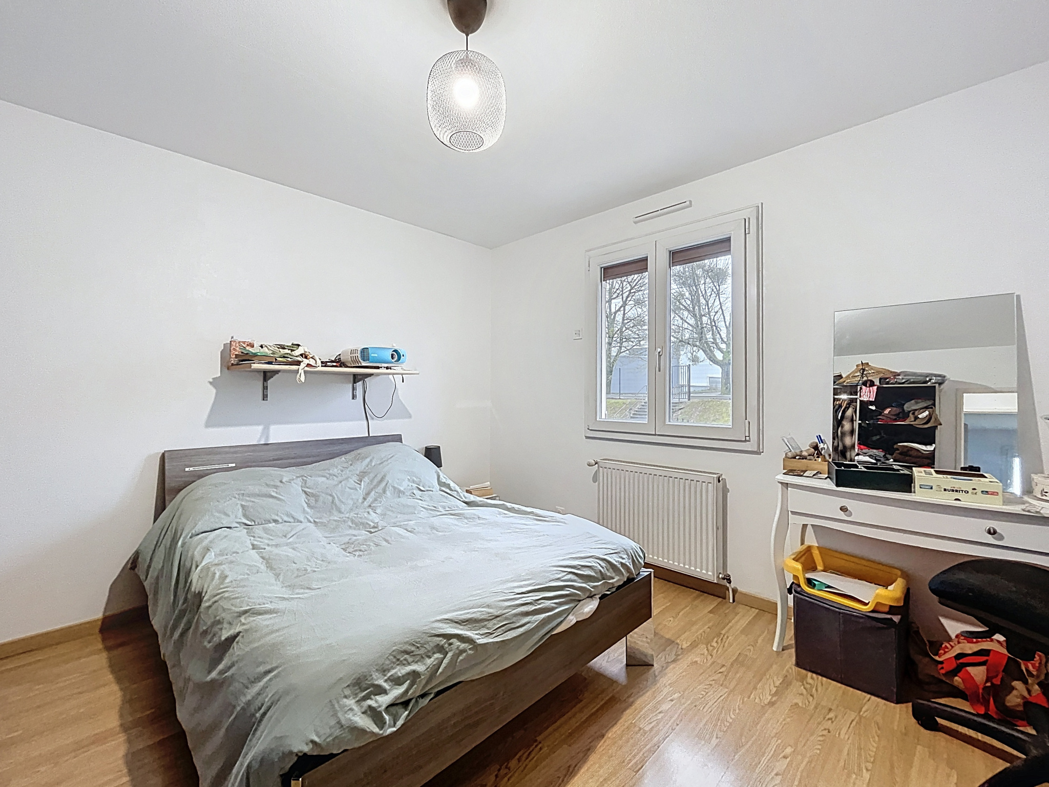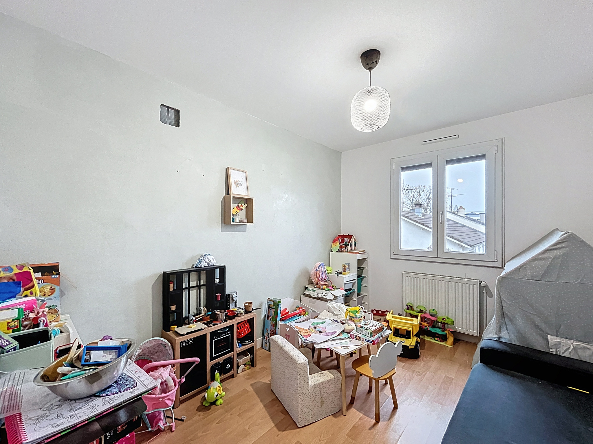 - Chambre 2 (9,80 m2) : sol parquet flottant, 1 fenêtre.