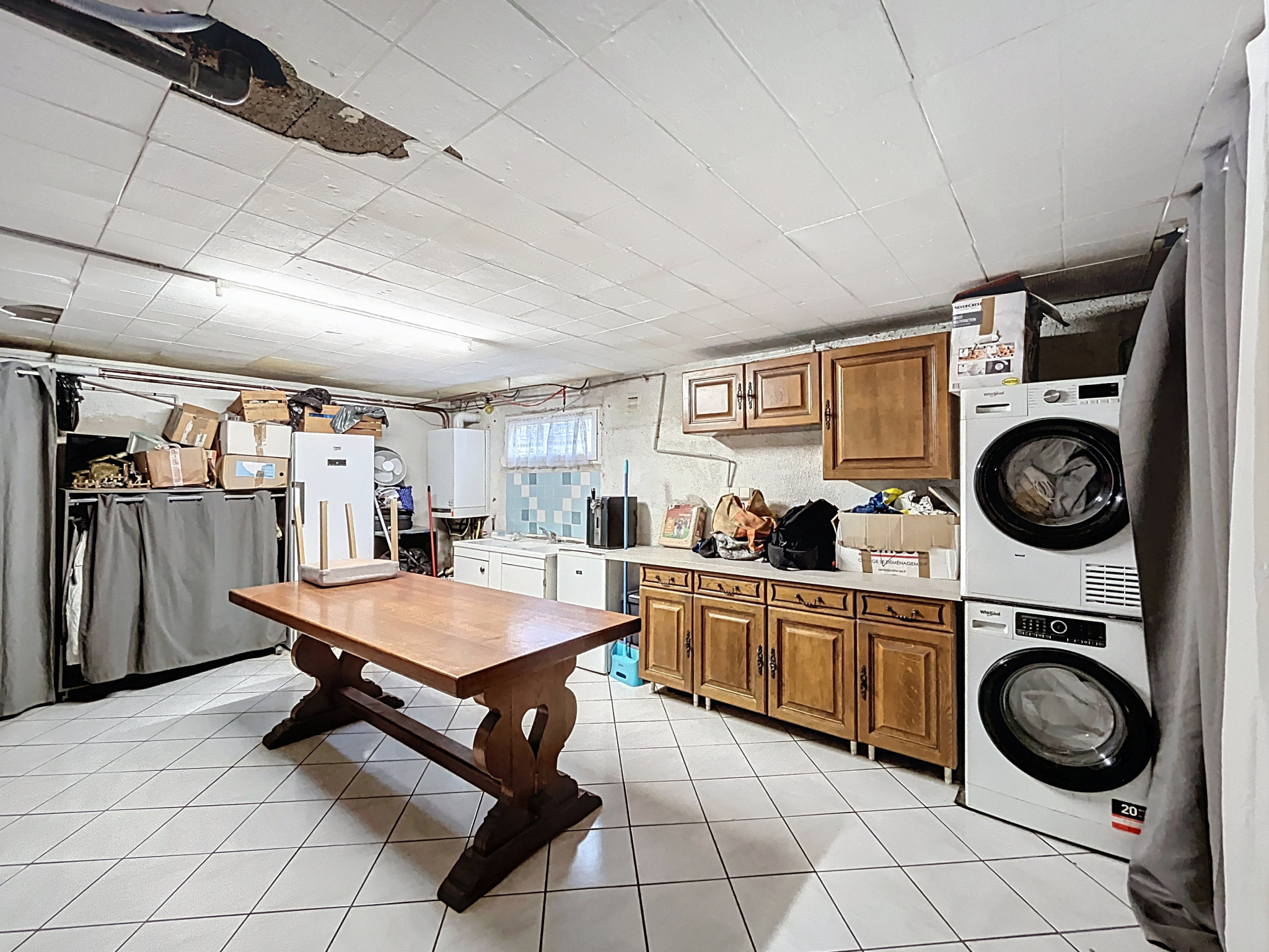 - Buanderie/chaufferie : sol carrelage, chaudière au gaz de ville alimentant une installation de chauffage central et production d'eau chaude, évier, branchement machine à laver, éléments de rangements.
