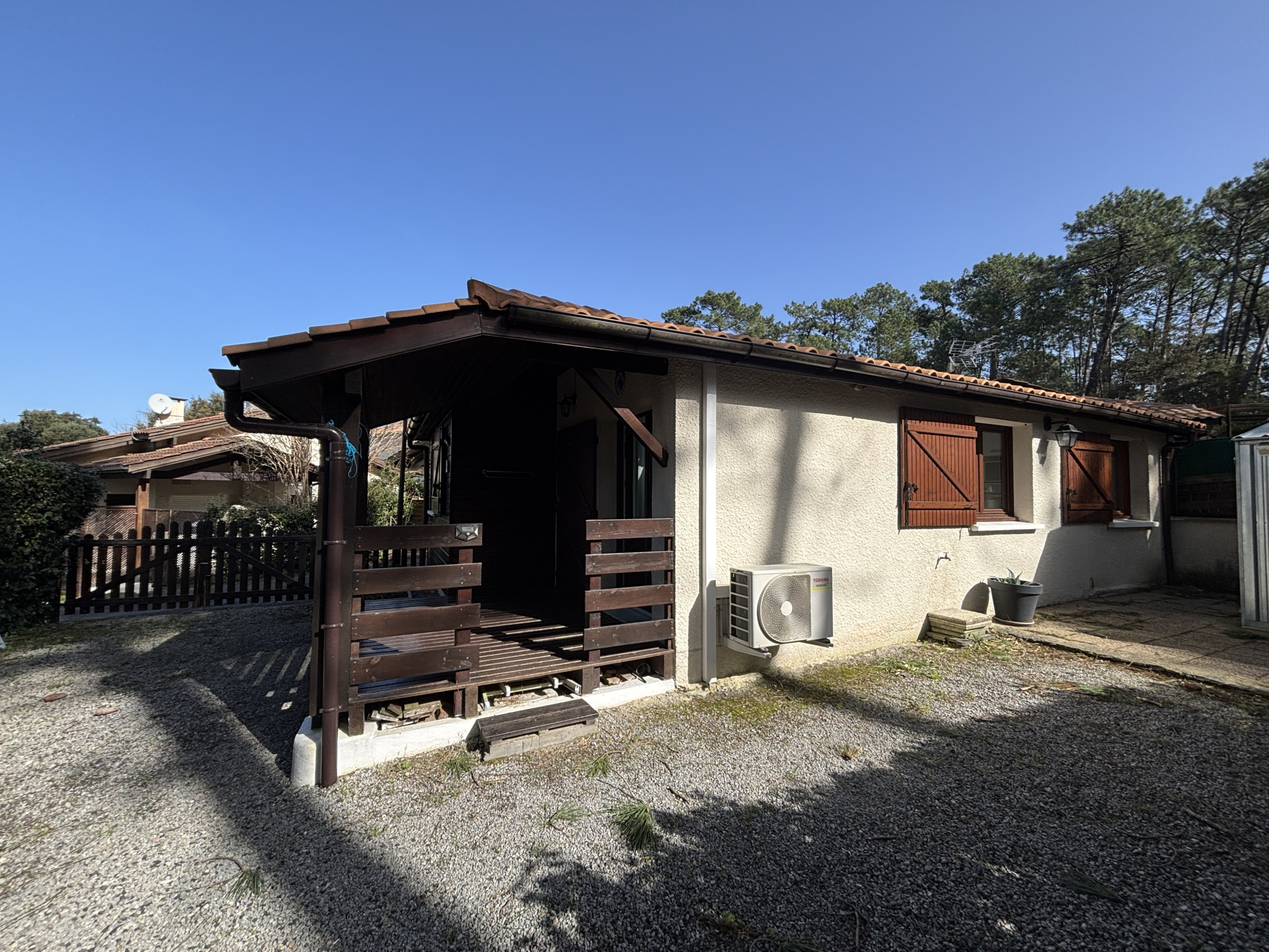 À l'extérieur, vous profiterez de la terrasse couverte et d'un terrain clos qui assure tranquillité et sécurité et peut accueillir 3 véhicules. Une remise de 9 m2 permet de stocker vélos, planches de surf ou matériel de jardin. Située face à la forêt de pins, la maison bénéficie d'un environnement calme et verdoyant, idéal pour profiter pleinement de la douceur de vivre et des plages à mois de 1,5km tout comme le Golf de Moliets (18 et 9 trous).