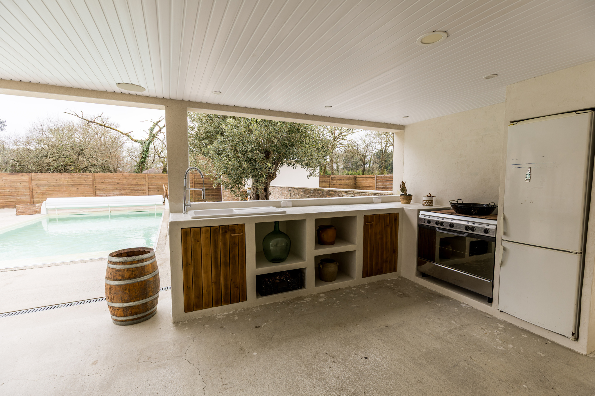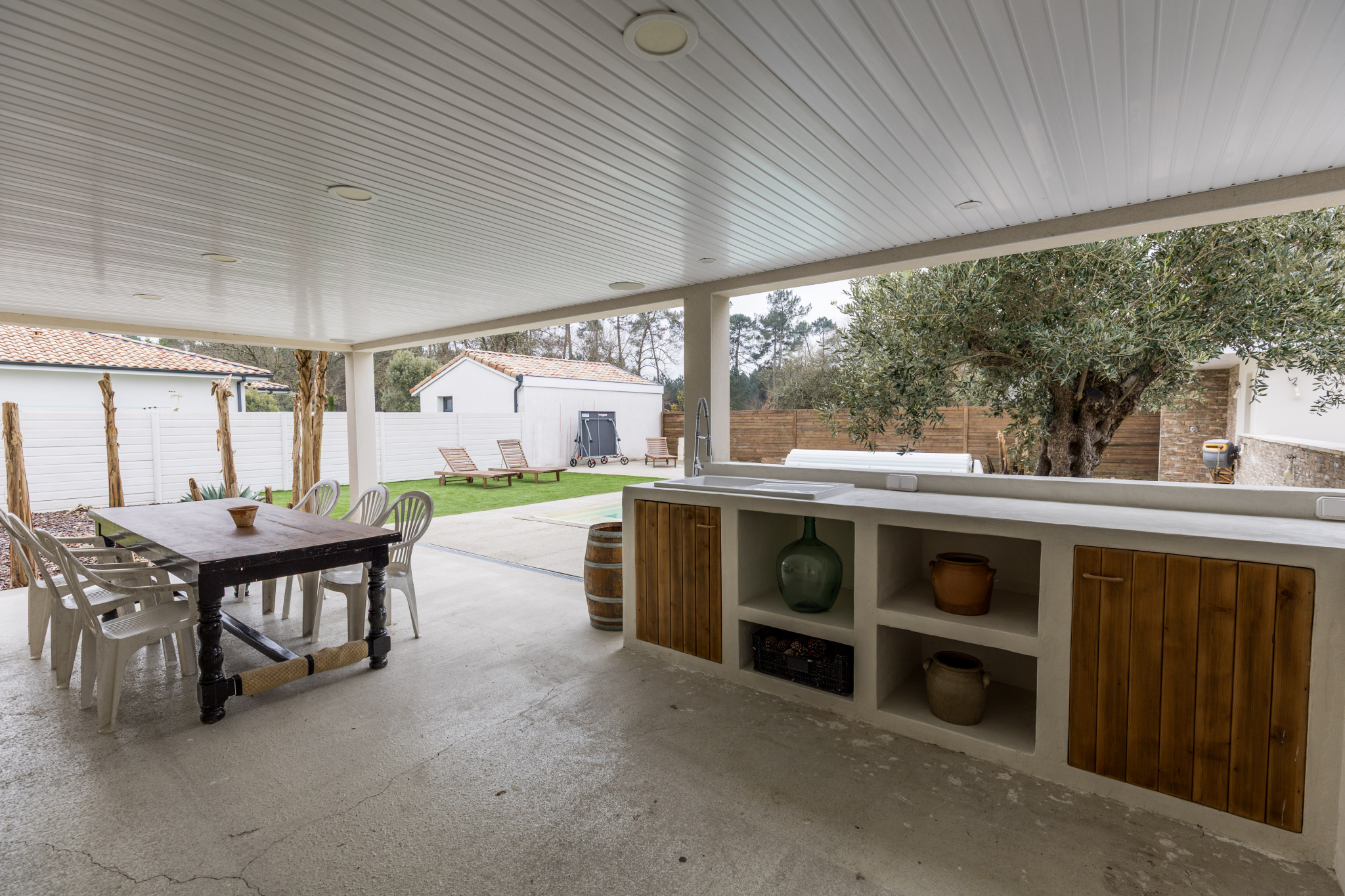 Une terrasse couverte aménagée avec cuisine d'été, véritable espace de vie extérieur, un terrain de pétanque vous attend pour des moments conviviaux!
