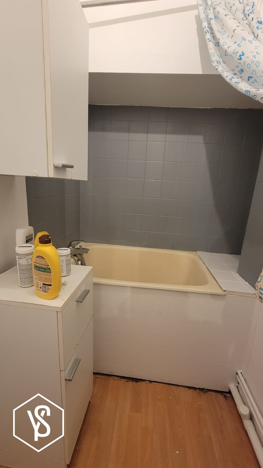 Cuisine séparée, pièce de vie, salle d'eau et WC. Appartement récement rénové avec factures. Charges trimestrielles de 215EUR, 62 lots principaux.
