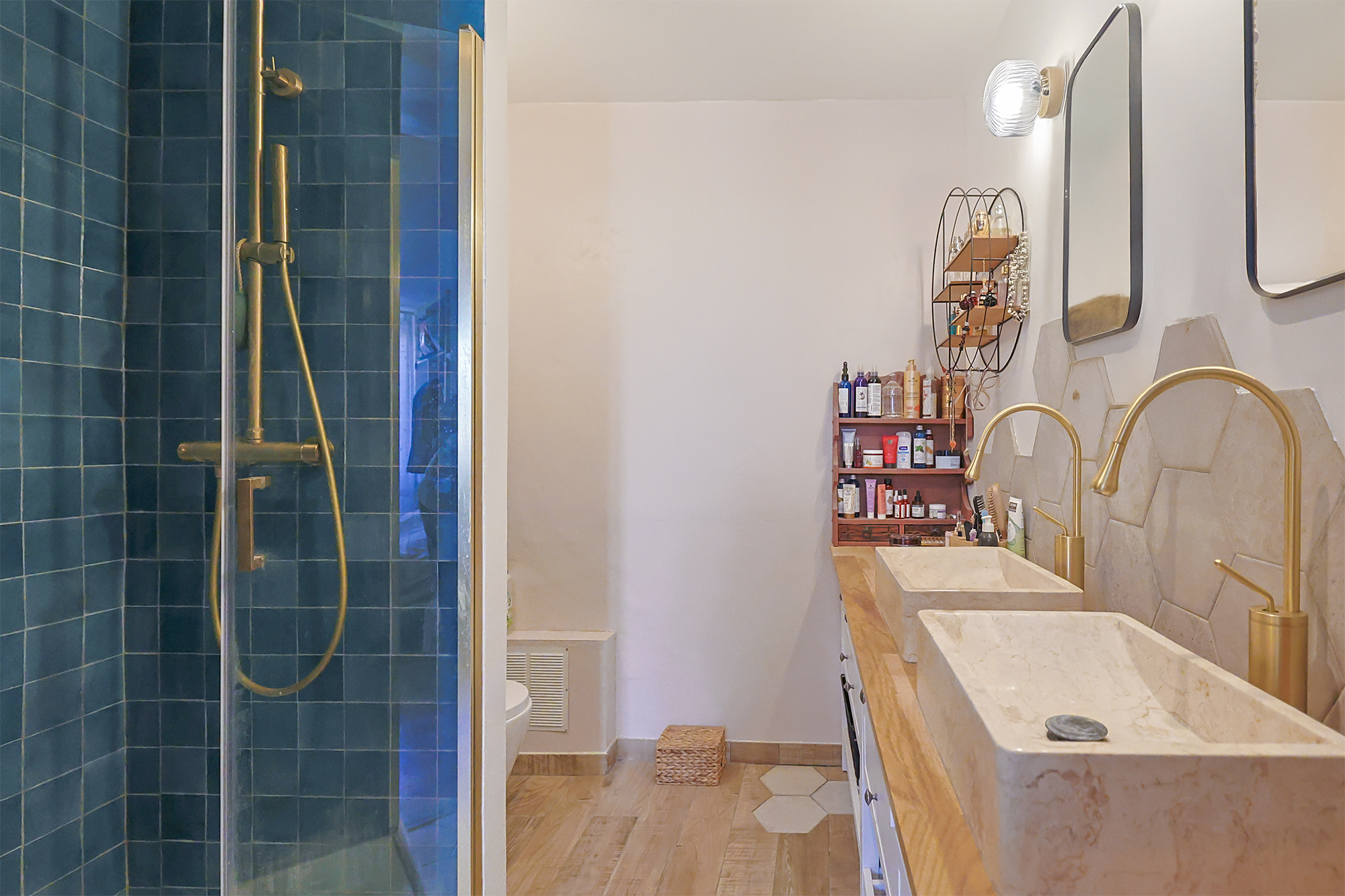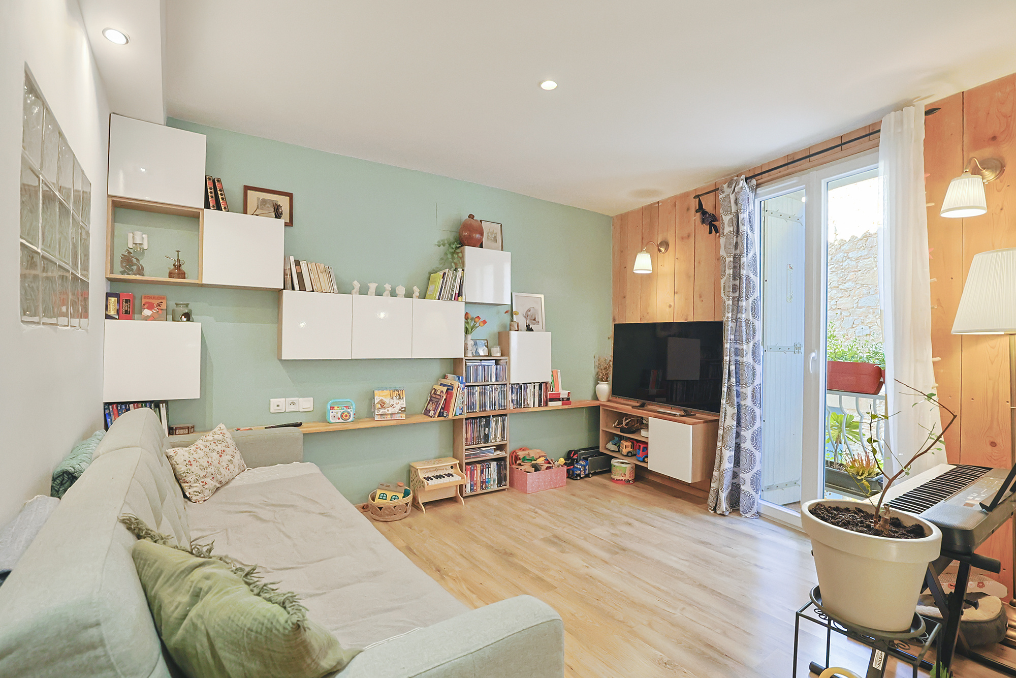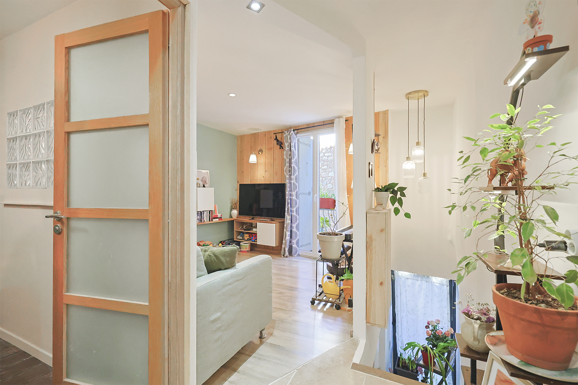 1er étage : un salon indépendant avec balcon, une salle de bains et WC séparé.