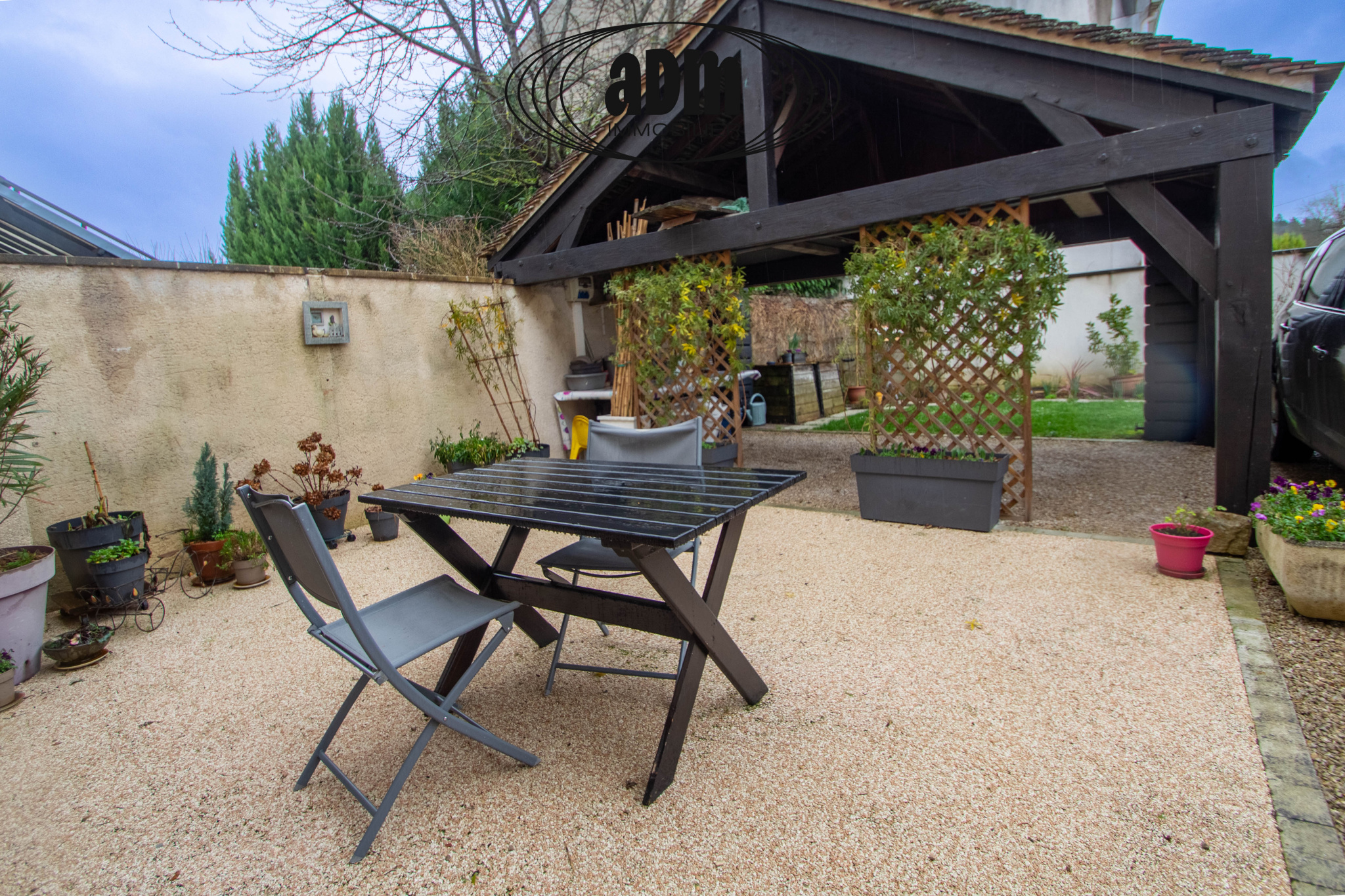 À l'extérieur : Terrasse conviviale, Jardin clos d'environ 365 m2, Stationnement pour 2 véhicules, Carport