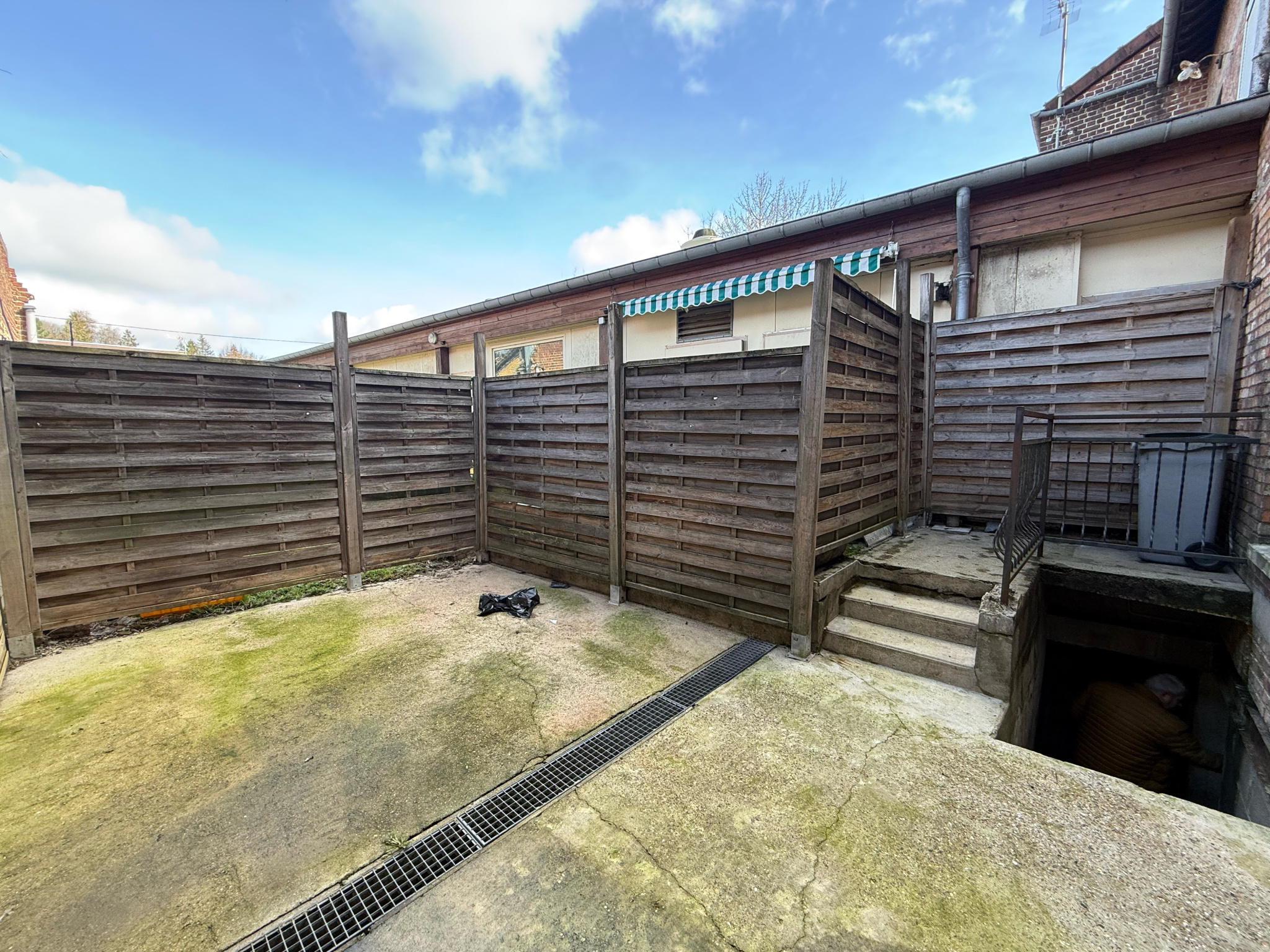 A l'extérieur : une cour en béton et une cave
