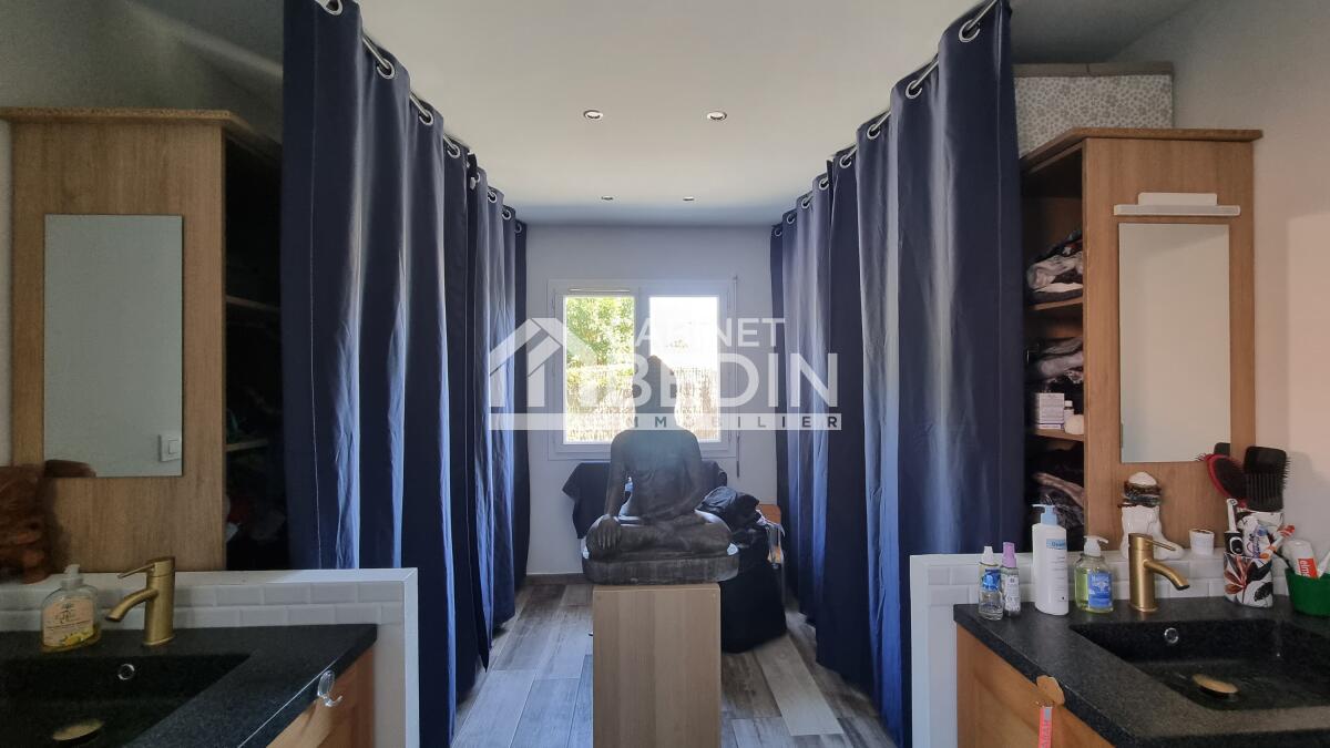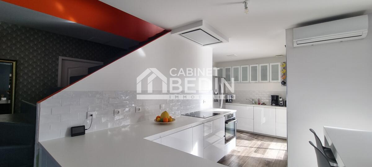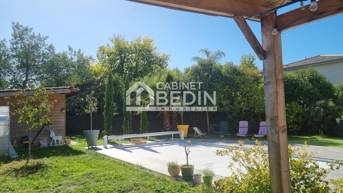 BRUGES . Elevée sur une belle parcelle verdoyante, cette maison familiale offre à la fois de grands espaces de vie pour se réunir et propose à chaque membre de la famille une chambre avec salle d'eau privative. L'espace nuit du rez-de-chaussée est réservé aux parents, vaste suite parentale composée d'une chambre et d'une salle de bains avec douche à l'italienne, baignoire, vasques et WC suspendu. La pièce de vie est largement vitrée sur le jardin et la terrasse, le pool house et la piscine. Le coin cuisine est ouvert, fonctionnel et entièrement équipé. Un escalier majestueux se dresse dans l'entrée et mène au palier de l'étage aménagé en salle de jeux et bibliothèque pour les enfants et d'une salle de sport pour les parents avec accès direct sur le balcon/terrasse offrant ainsi une vue dégagée sur la piscine et le jardin. A l'étage quatre chambres avec chacune sa salle d'eau, l'une d'entre elle est équipé d'un WC supplémentaire. A la convivialité et le charme de ce lieu aux belles prestations s'ajoute un confort technique : maison chauffée par pompe à chaleur basse température, l'ensemble est gainé sur les 2 étages, chauffage au sol en R+1, climatisation réversible, baies vitrées et fenêtres en aluminium double vitrage. L'entrée est équipée d'un vestiaire penderie et étagères, d'un WC indépendant et permet d'accéder au garage où se trouvent chaufferie et buanderie. Particulièrement bien pensée et aménagée à l'intérieur, l'extérieur est tout aussi agréable avec des espaces où chacun peut se détendre, entre amis ou en famille autour du boulodrome ou encore de la piscine et du pool-house, ou tranquillement sur la terrasse entourée d'espaces verts. La gestion des voitures est simple, garage, 2 places de stationnement sur le côté et un grand jardin d'accueil précède cette maison rénovée en 2018 sans aucune mitoyenneté ni vis à vis. A cela s'ajoute la proximité du tram C arrêt la vache, et pour les joggers la voie verte est accessible en quelques foulées. Très du Bouscat, des commerces et des écoles, l'accès au boulevards est rapide. Appelez-nous au 0557225500 pour visiter ce bien rare qui vous offrira un confort et une qualité de vie, au calme. . Les informations sur les risques auxquels ce bien est exposé sont disponibles sur le site Géorisques : www. georisques. gouv. fr. Montant estimé des dépenses annuelles d?énergie pour un usage standard : entre 1190 et 1670 Euros/an (année de référence 2023)
