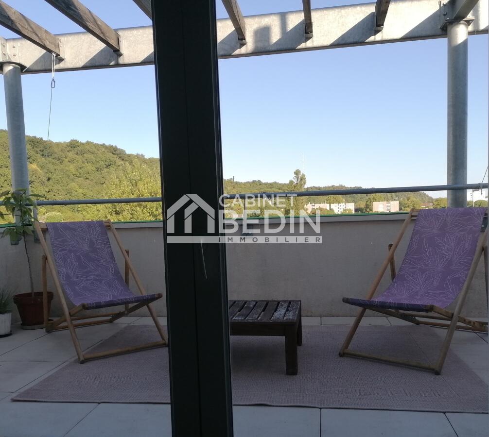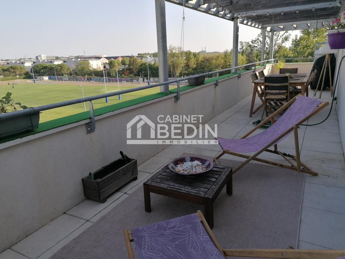 FLOIRAC. Situé au 4ème et dernier étage d?une résidence récente de 2015, cet appartement T3 se distingue par sa terrasse panoramique de 40 m² environ, véritable atout de ce bien, offrant une vue dégagée et un espace extérieur exceptionnel.