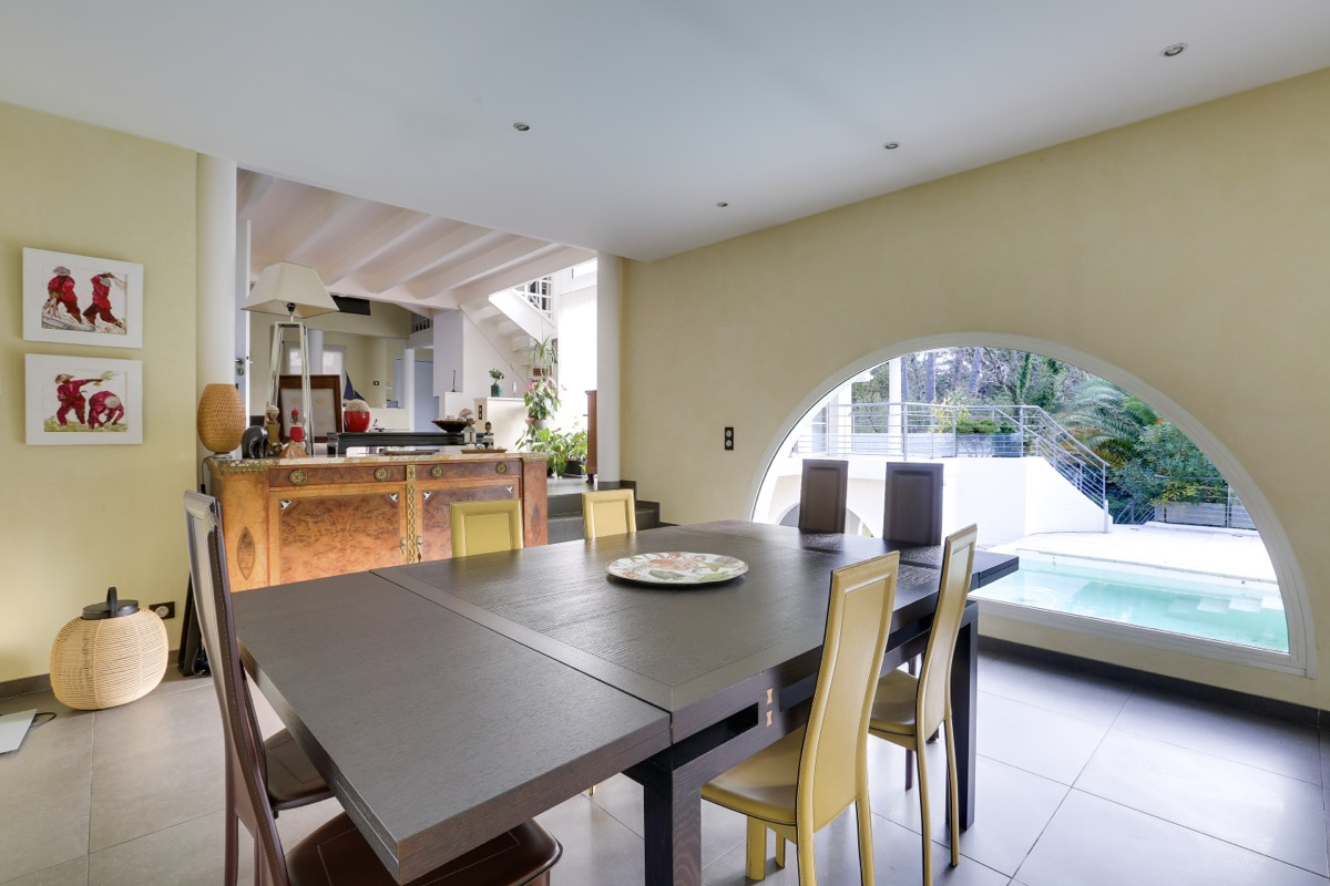 À l'extérieur, plusieurs terrasses prolongent les espaces de vie, dont une terrasse couverte d'environ 40 m2. Le jardin arboré et paysager de plus de 1 400 m2, parfaitement préservé, intègre harmonieusement la piscine au sel, offrant calme, luminosité et ensoleillement tout au long de la journée.
