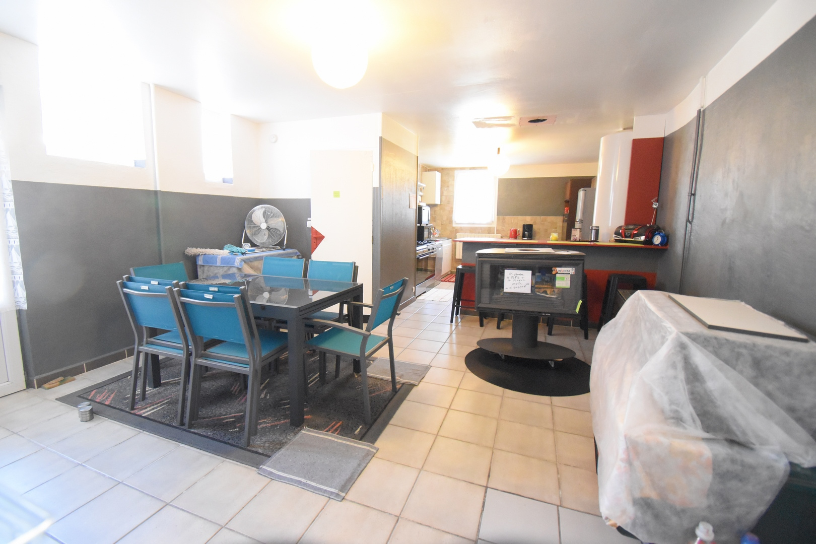 Maison de bourg de plain-pied, entièrement rénovée, comprenant une cuisine ouverte sur séjour, un salon, trois chambres, un bureau, une salle d'eau et un WC.