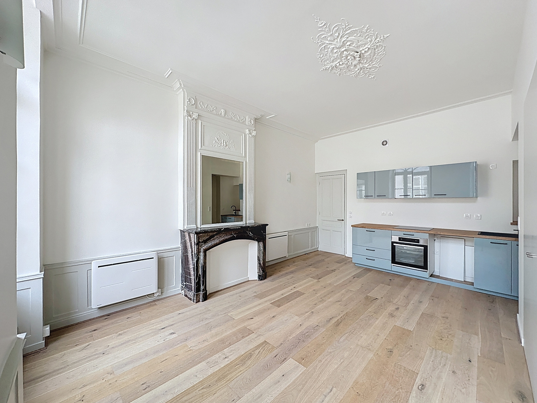 Parquet, cheminées en marbre et moulures.