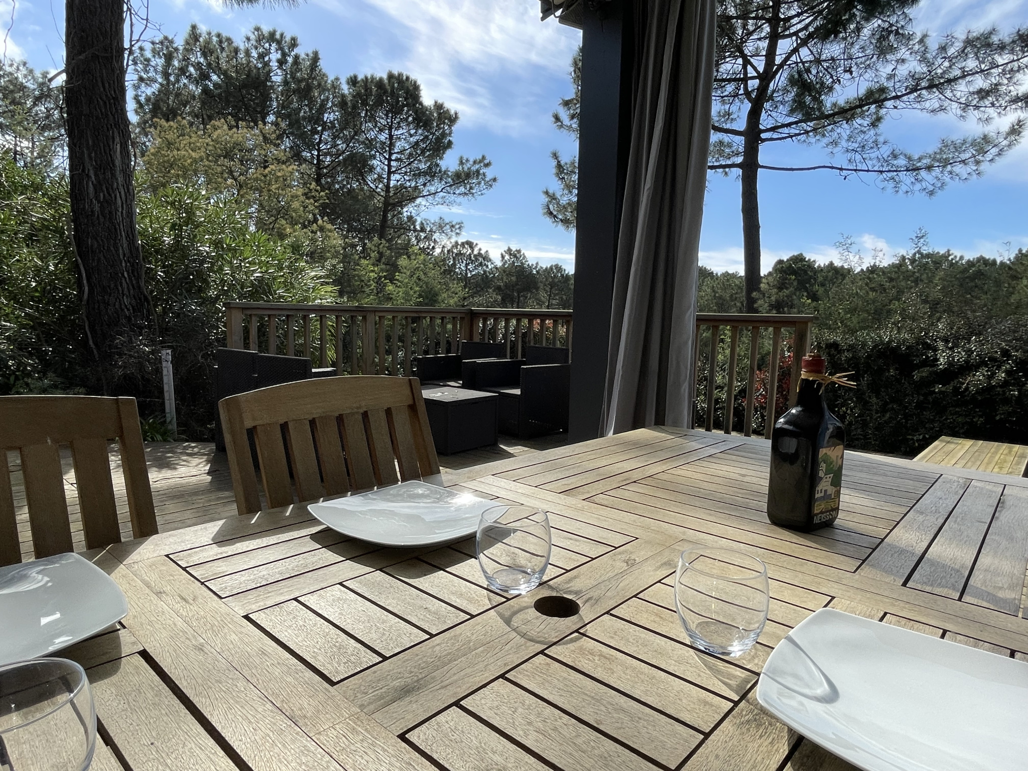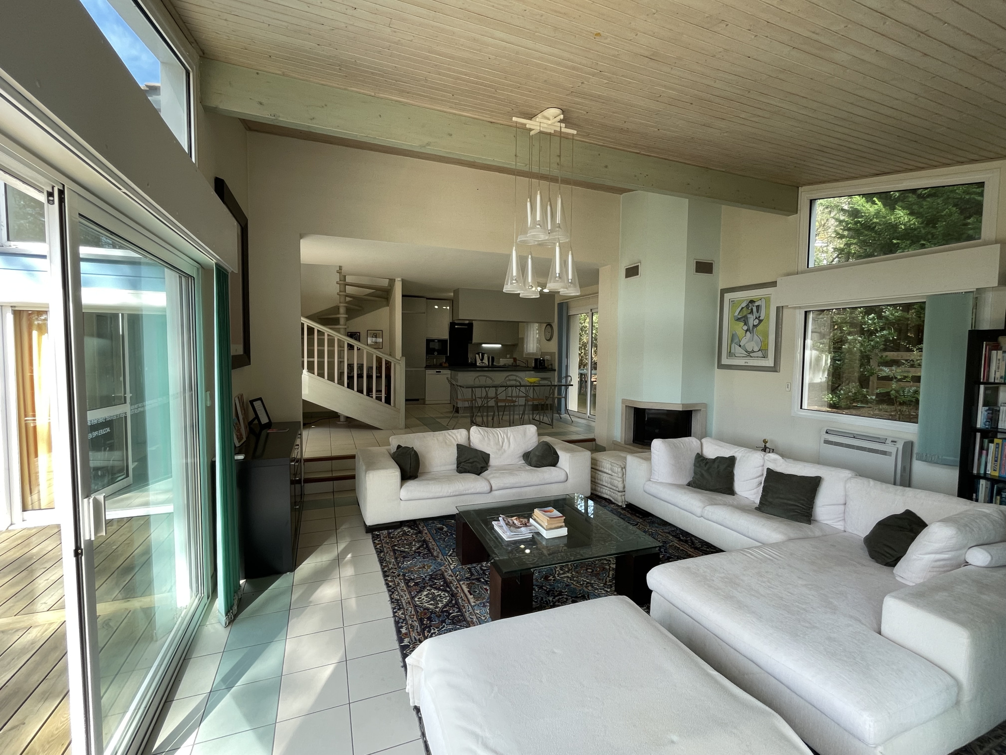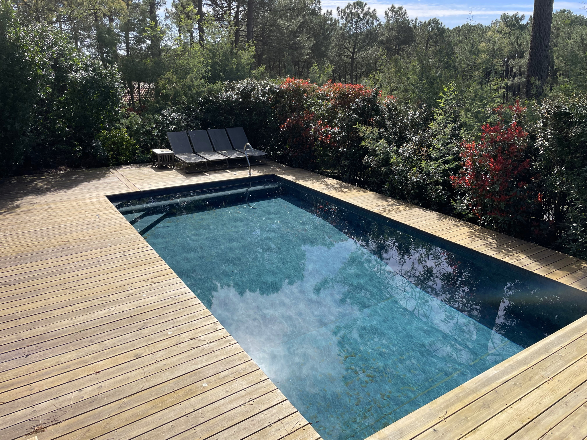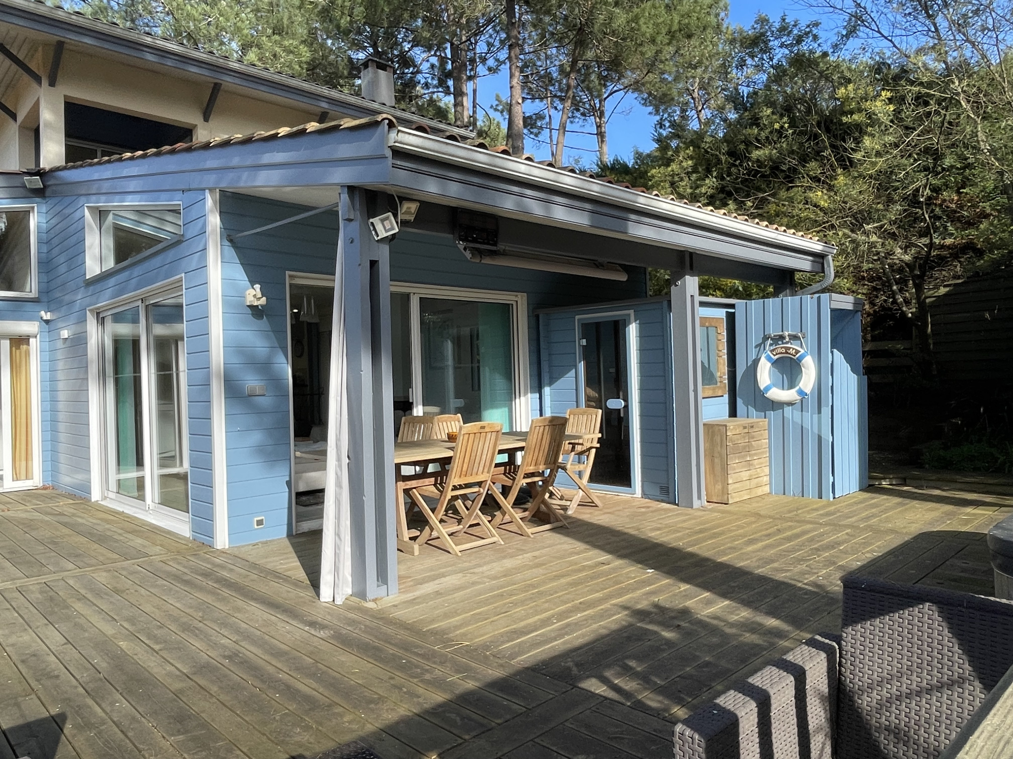 100 m2 de terrasse, piscine chauffée par une pompe à chaleur, haut parleur aquatique, liner armé qualité hôtelière.