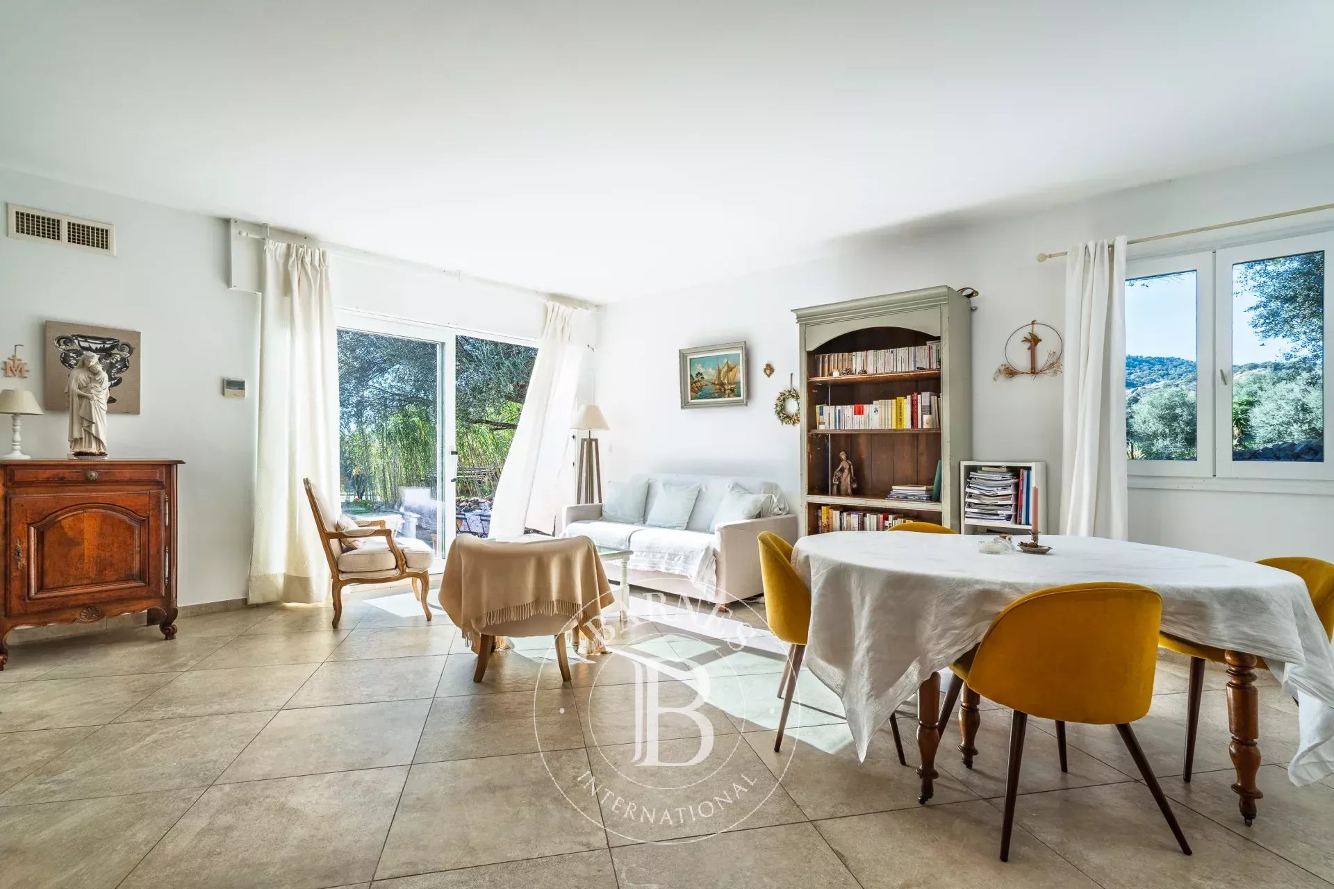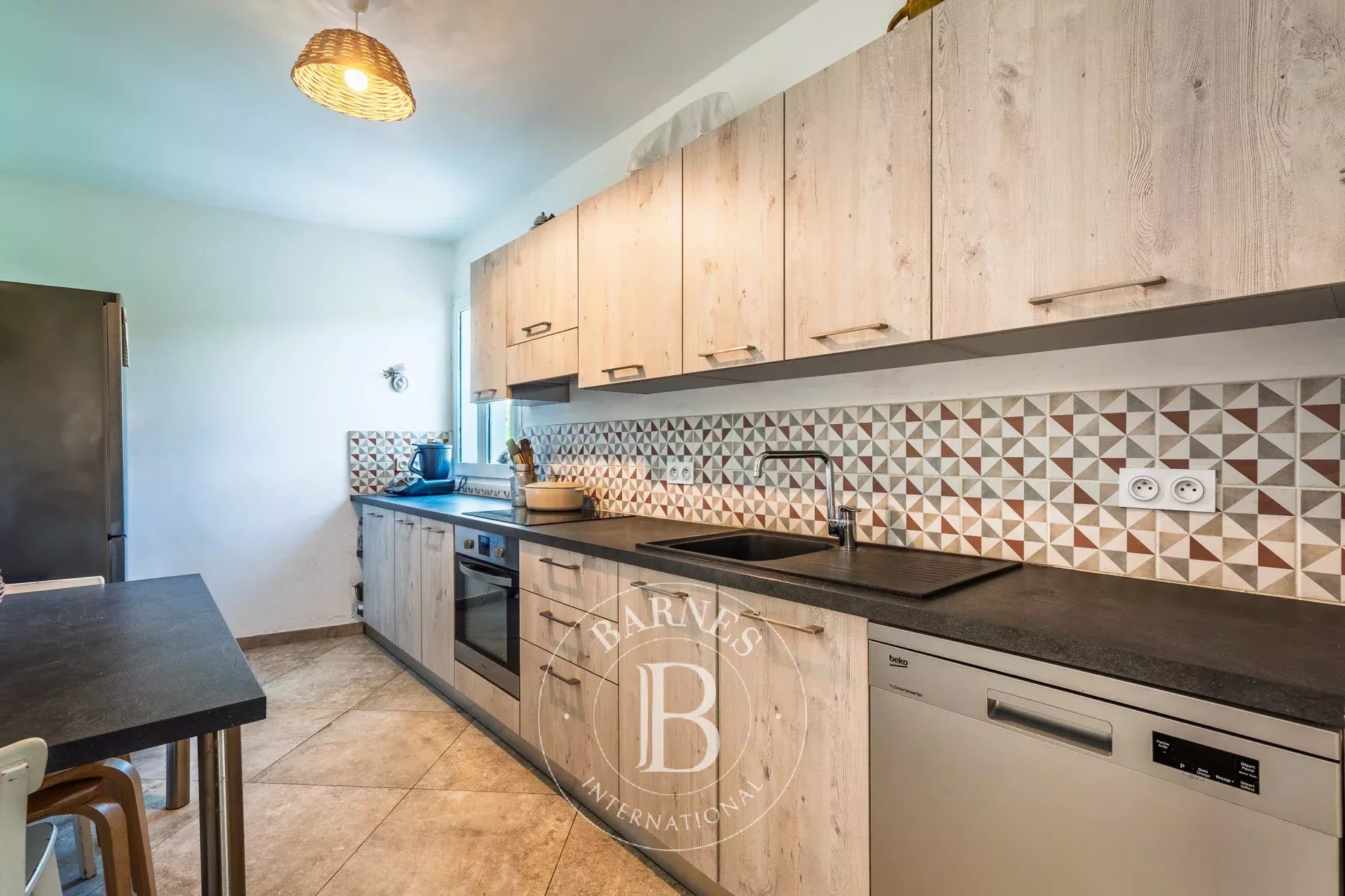 De plain-pied, la villa d’environ 136 m² offre un séjour s’ouvrant sur une terrasse avec vue sur les montagnes, une cuisine indépendante et une buanderie.