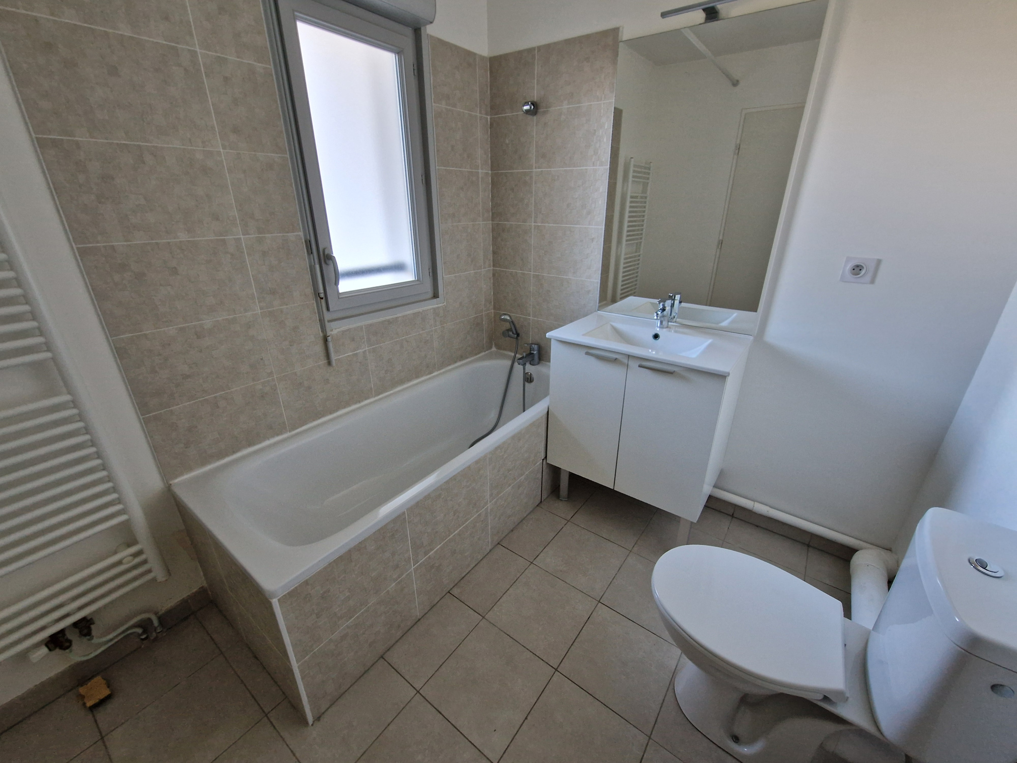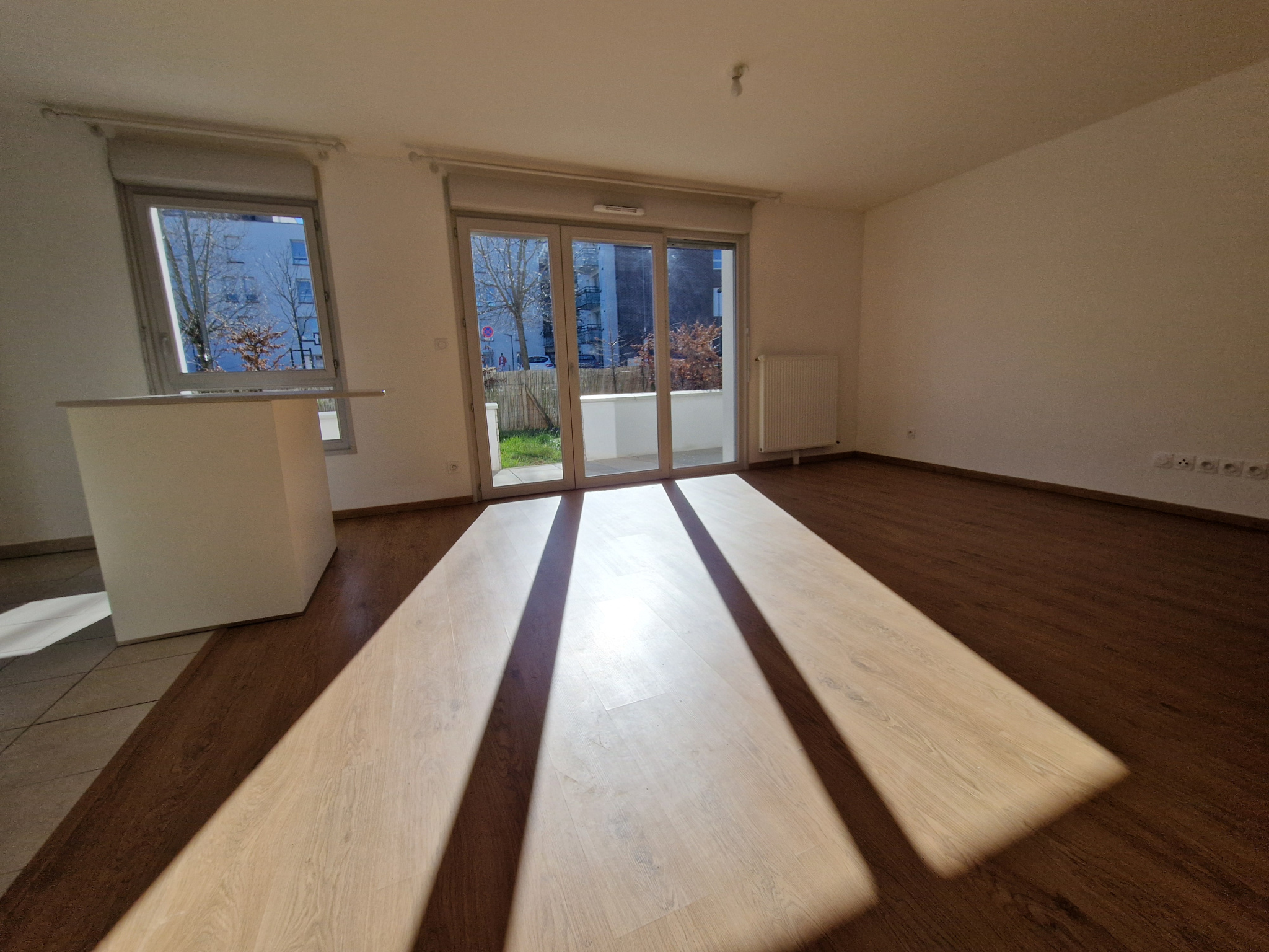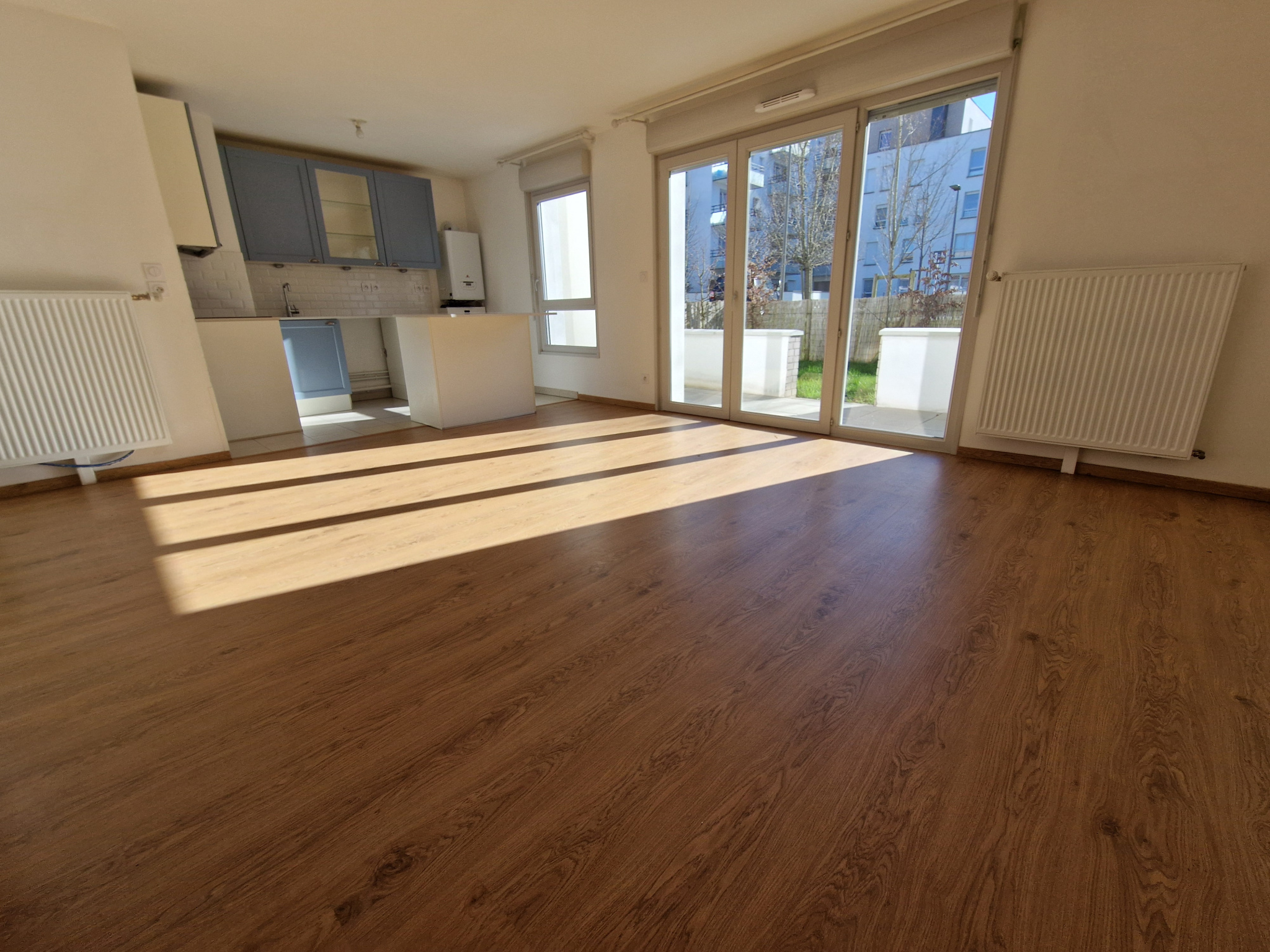 Entrée dans une belle pièce de vie avec cuisine ouverte (28 m2), grand WC (avec évacuation pour machine à laver).
