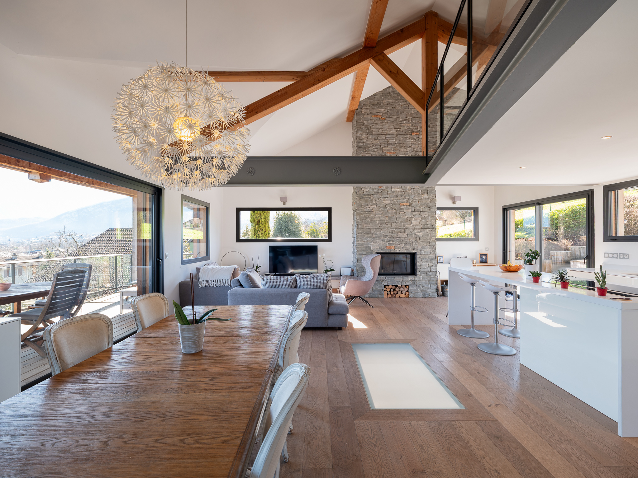 A l'étage auquel on accède par un escalier en bois et métal, une grande pièce de vie traversante vous permet de profiter du panorama. L'hiver vous pourrez bouquiner au coin du feu, l'été partager un moment de convivialité autour de la piscine chauffée.
