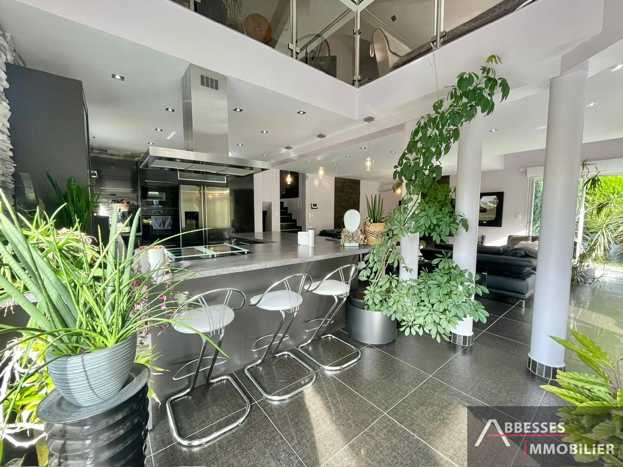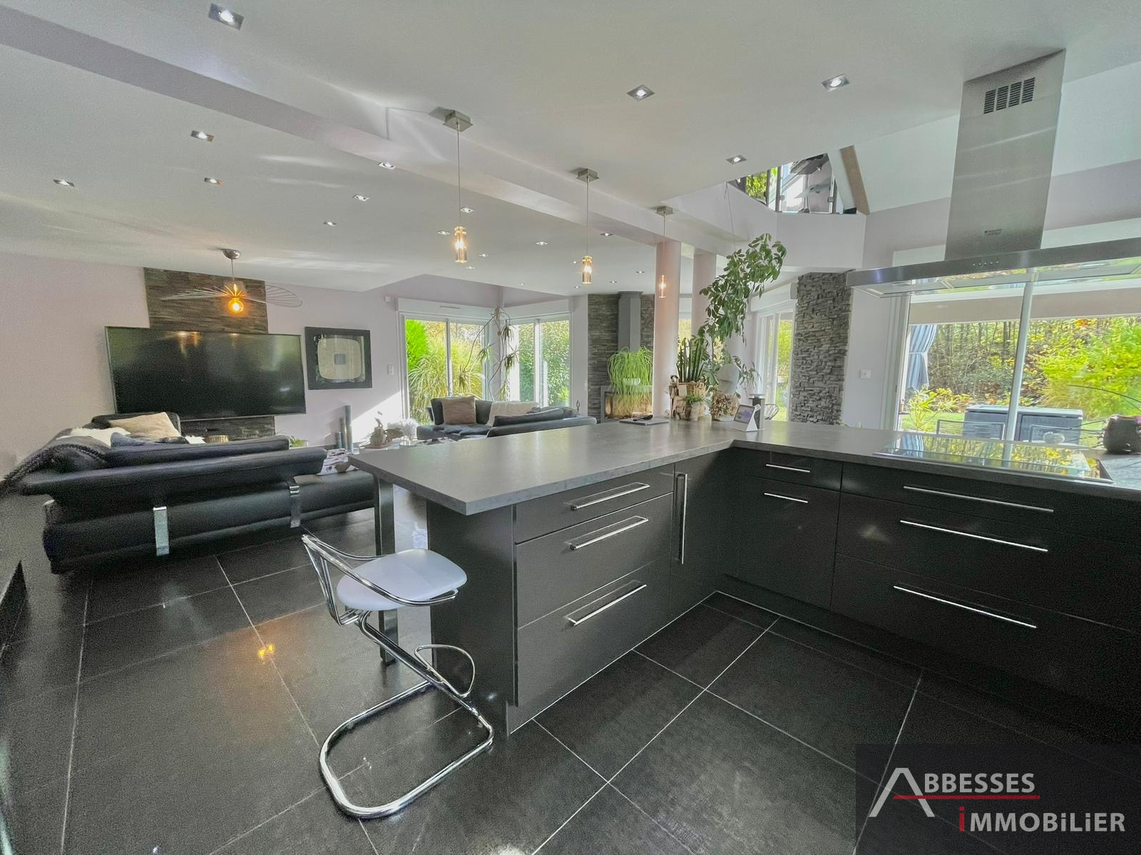 En demi niveau : cuisine équipée moderne ouverte sur salon-séjour avec cheminée / accès terrasse dallée. Jacuzzi.