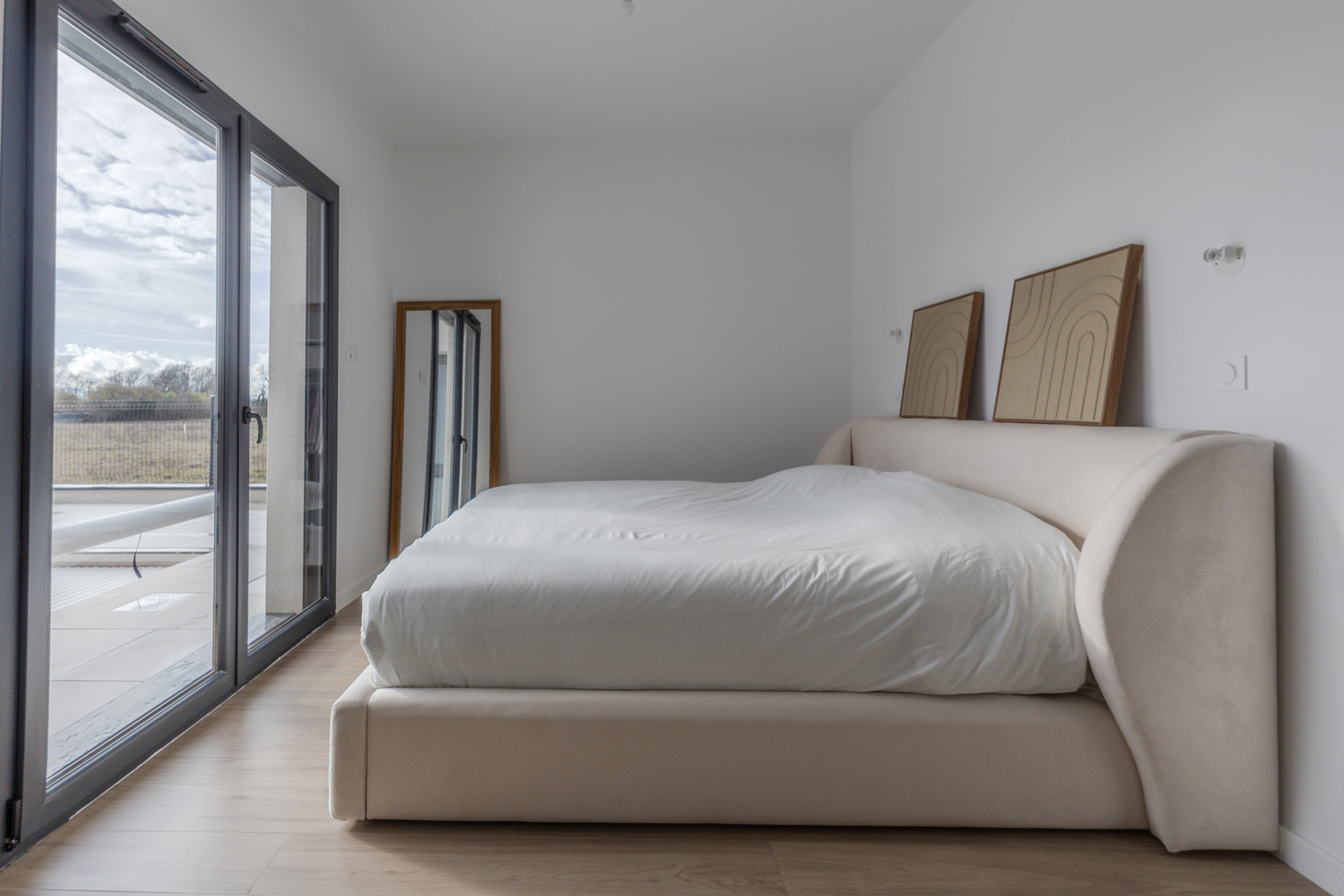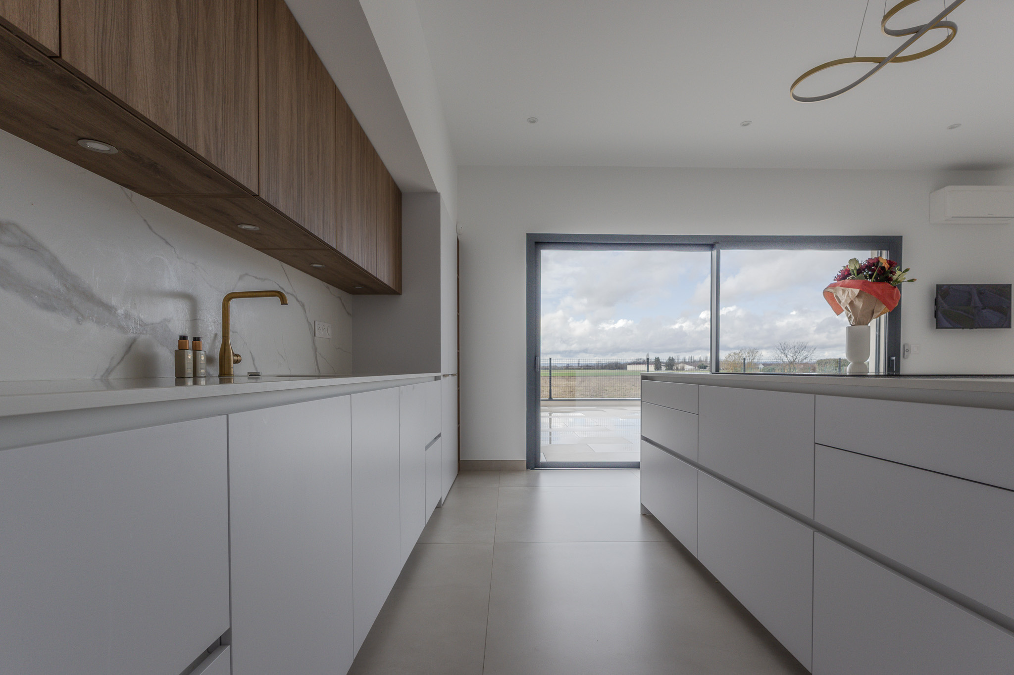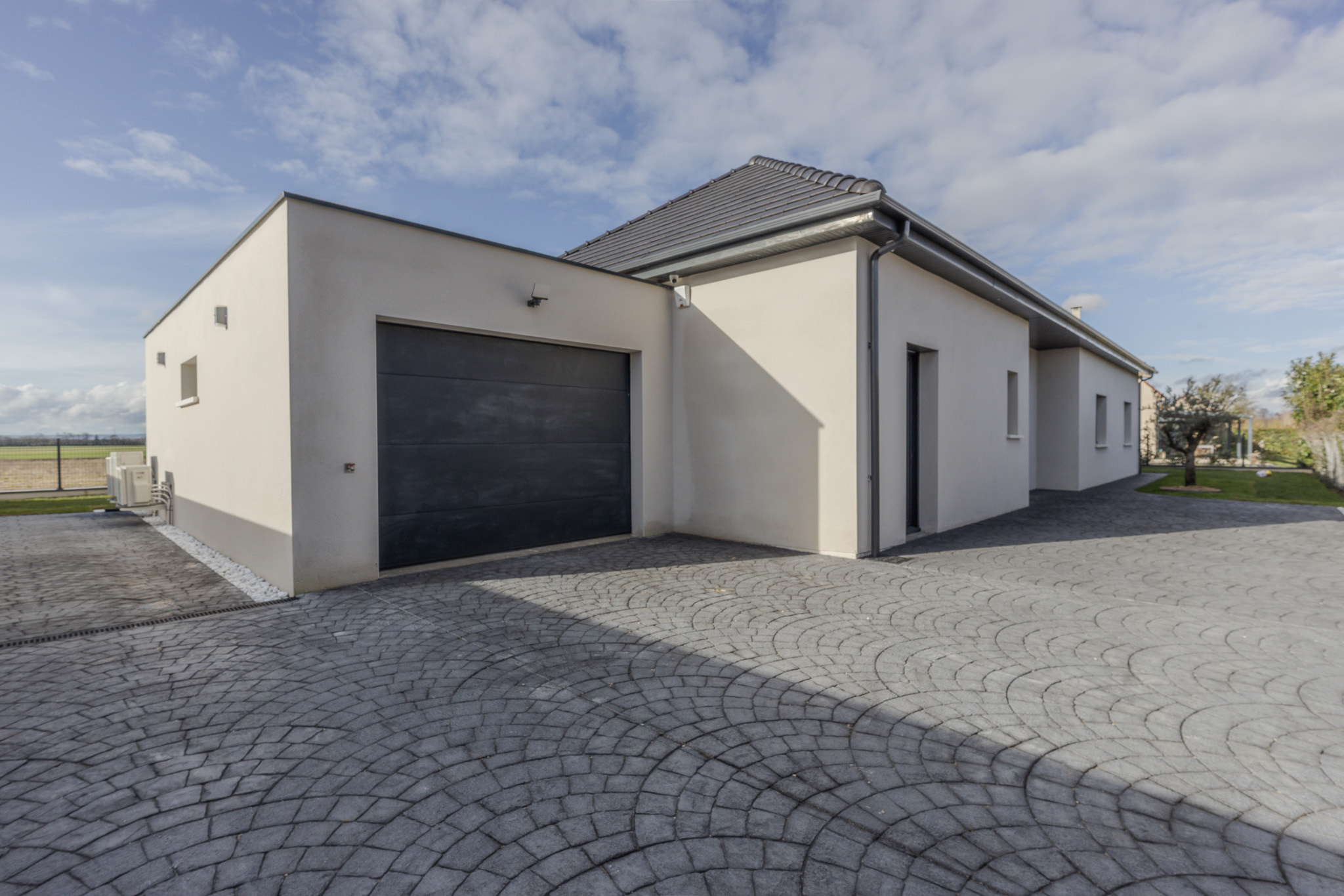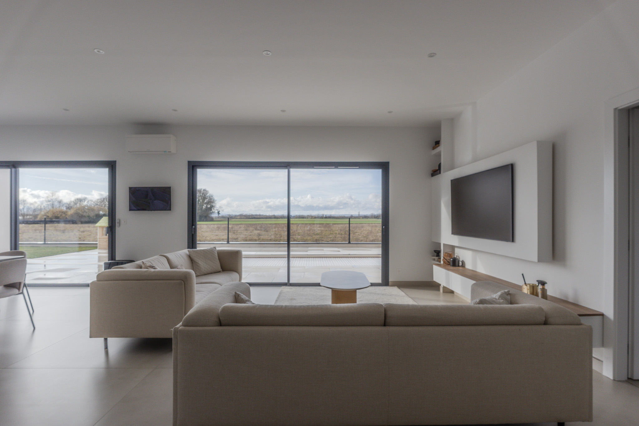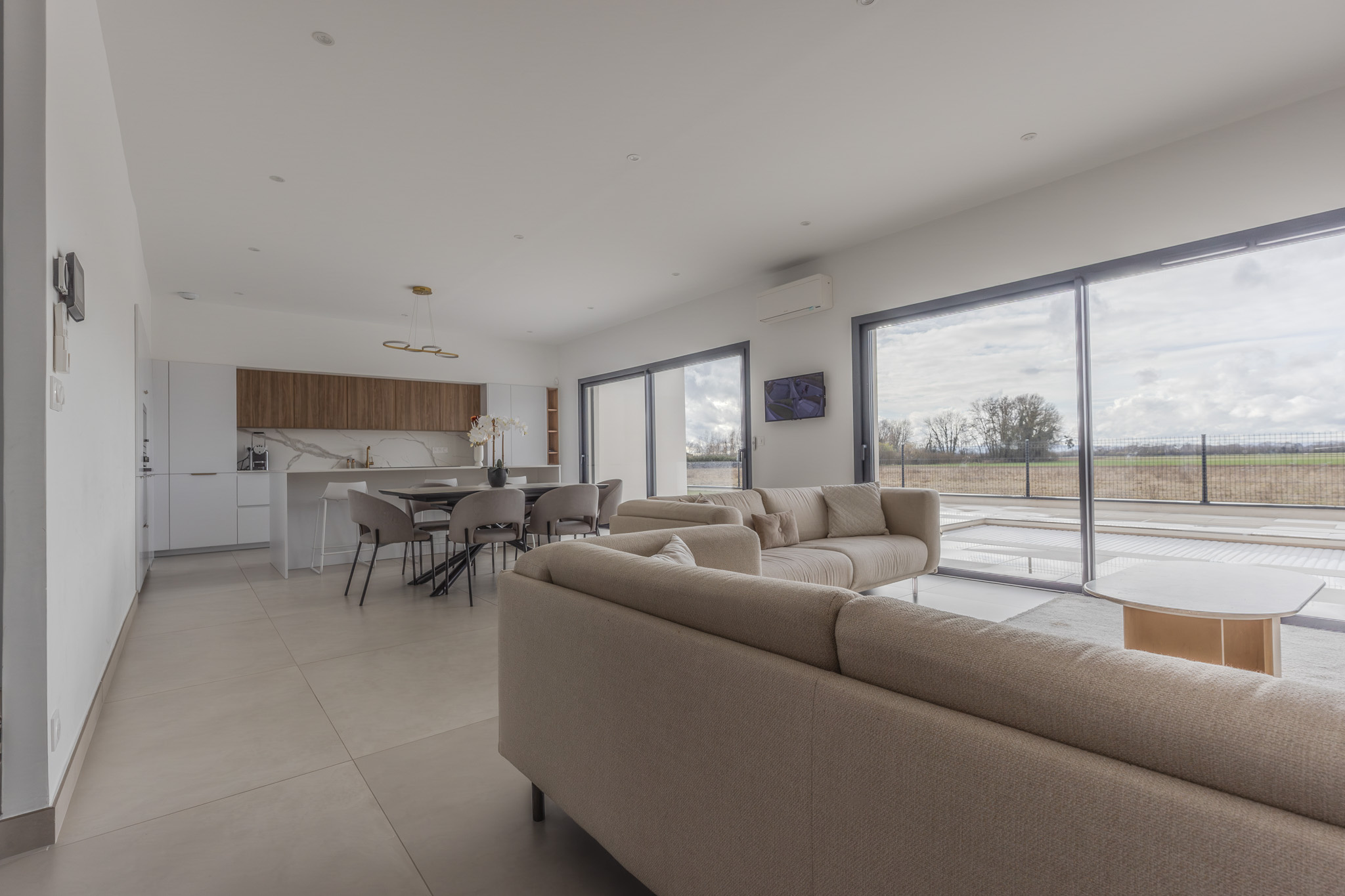 Maison contemporaine de plain pied avec piscine , belle vue dégagée les champs et sans vis à vis.