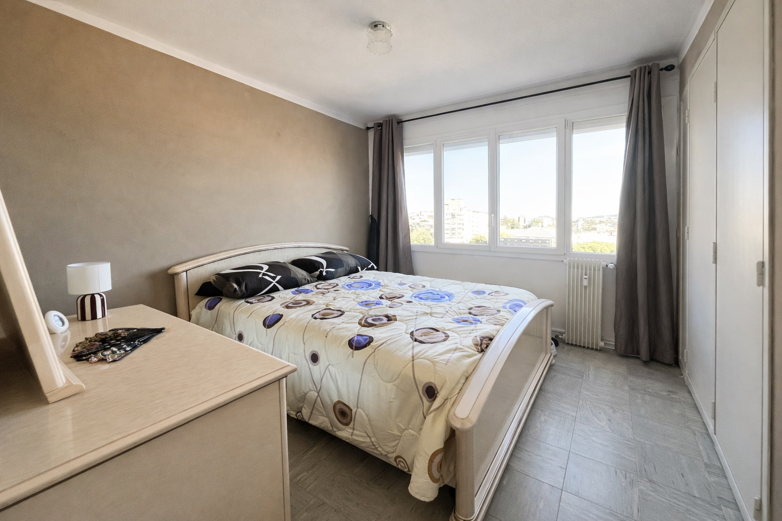 Situé au 5ème étage avec ascenseur d'une copropriété sécurisée avec gardien, ce bien vous offre un cadre de vie confortable, ainsi qu'une vue panoramique imprenable. Il se compose d'une entrée, d'un séjour lumineux exposé ouest avec cuisine ouverte, de deux chambres avec placards, d'un cellier, d'une salle d'eau et d'un WC séparé.