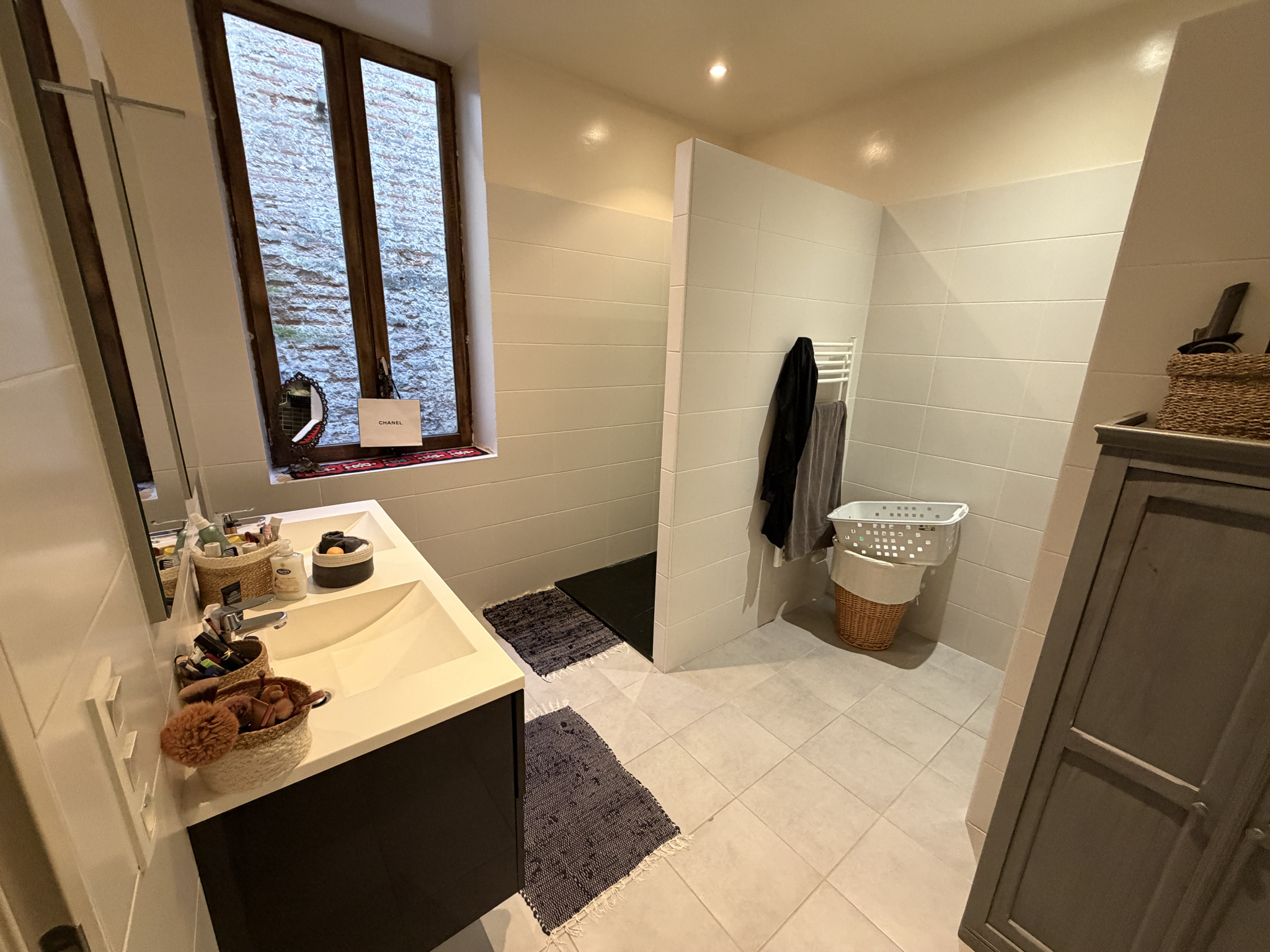 Au rez-de-chaussée, vous profiterez d'une belle pièce de vie incluant une cuisine équipée de 47 m2 avec mur en briquettes apparentes et ayant un accès vers une cour intérieure.