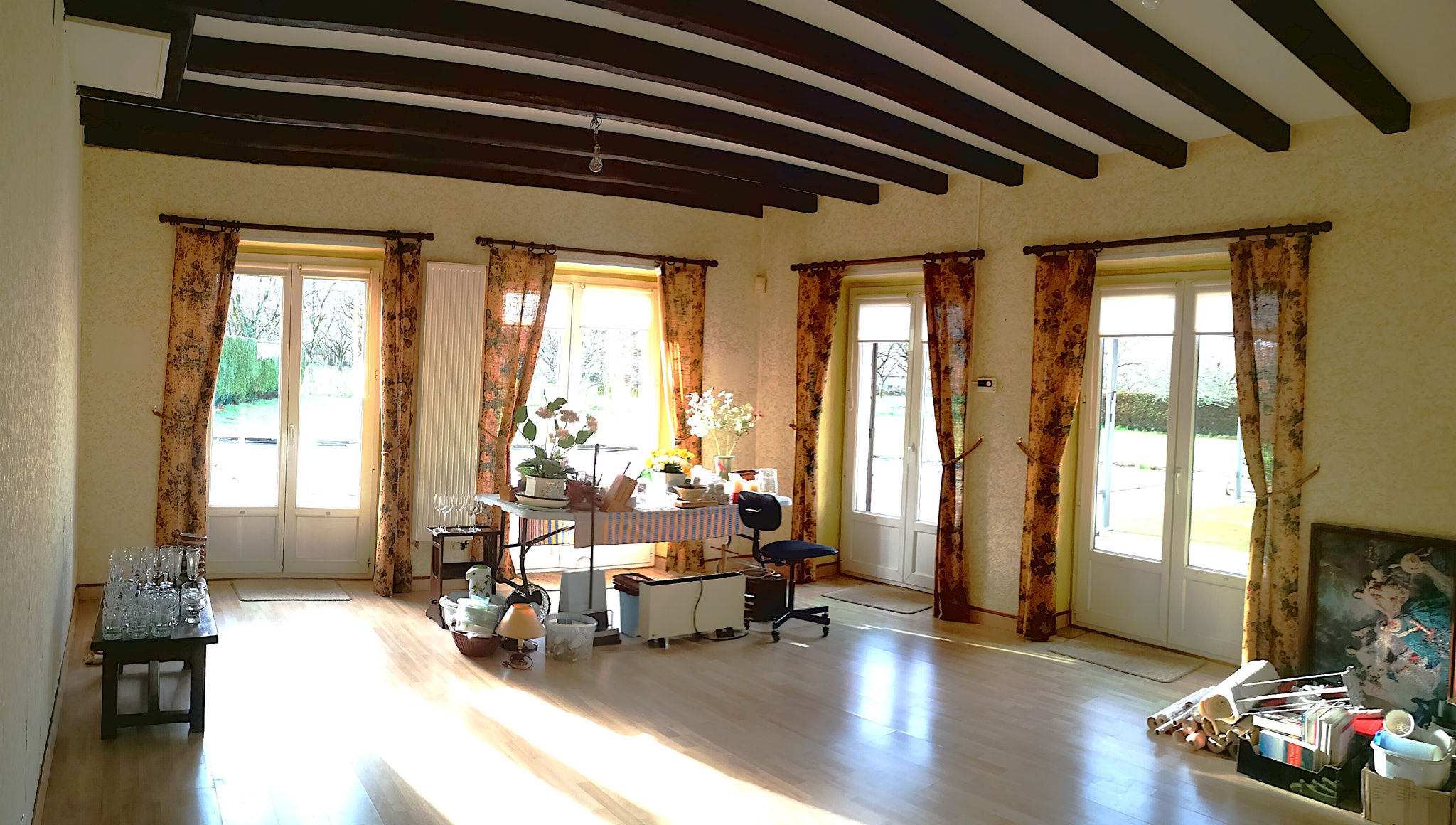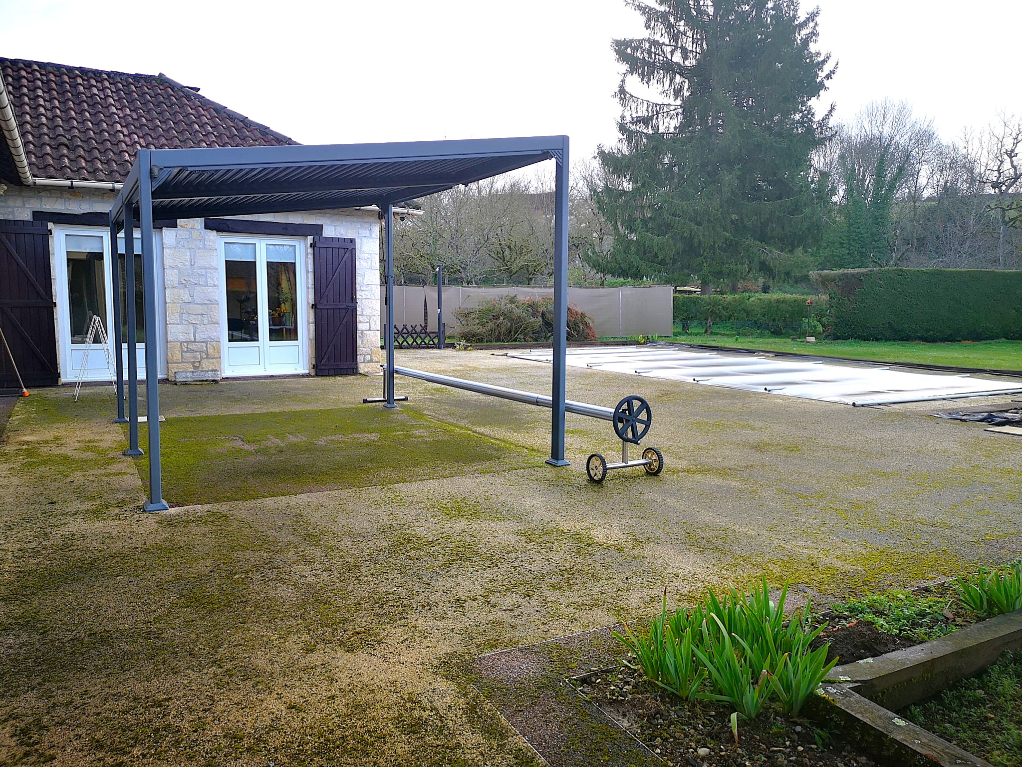 Le séjour et les chambres donnent directement sur une grande terrasse extérieure qui va être entièrement refaite et qui inclue la piscine et une pergola. Un garage indépendant en bois, avec atelier attenant, complète l'ensemble qui est implanté sur 3089 m2 de terrain plat.