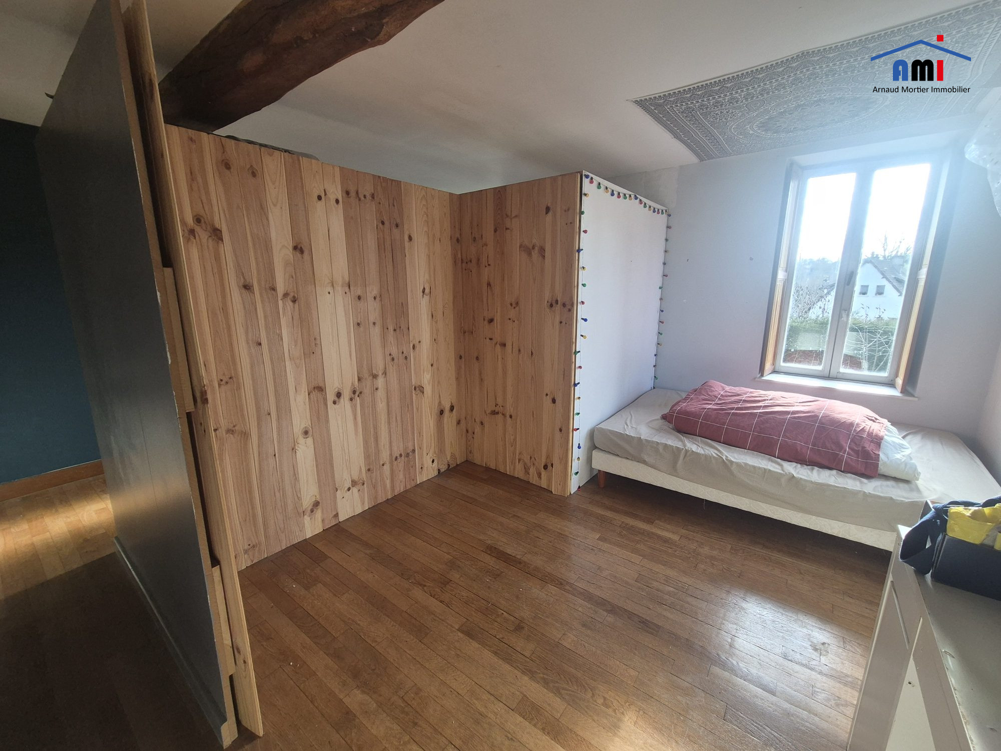 A l'étage palier, chambre avec parquet (20 m²), chambre avec cheminée ( 14m²), salle de bains avec douche et wc. Sous les combles deux chambres en enfilade. Fenêtres en bois (dbv), chauffage central par pompe à chaleur + poêle à bois. Assainissement tout-à-l'égout. Dépendance chaufferie, atelier avec grenier , puits. le tout sur un terrain clos d'environ 750 m².