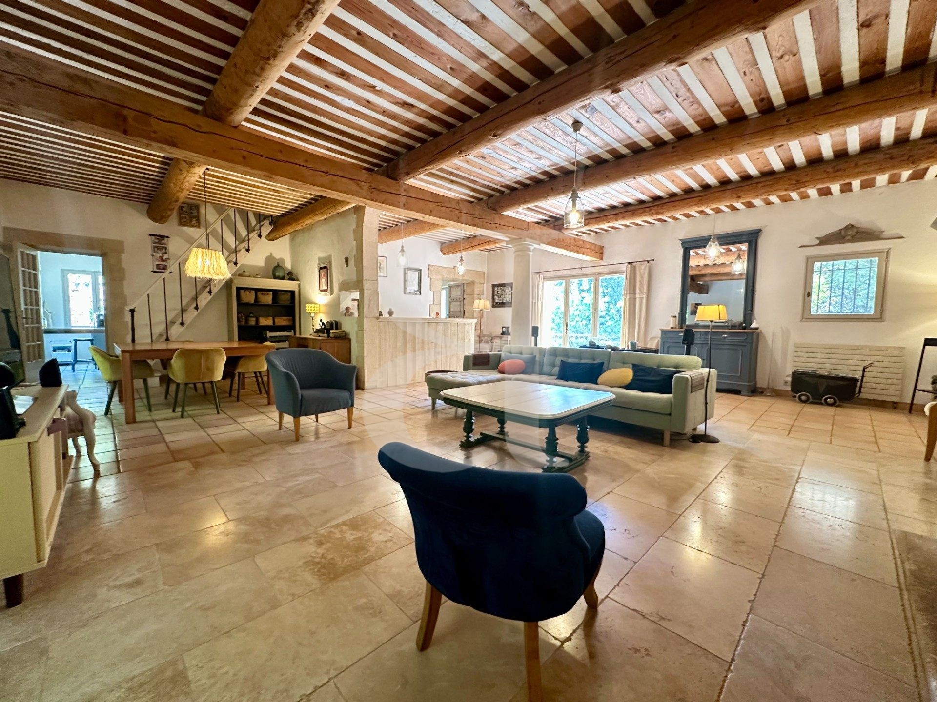 L'espace de vie, baigné de lumière, s'articule autour d'un somptueux séjour aux plafonds à la provençale et poutres apparentes, orné d'une cheminée en pierre de Ménerbes, d'une salle à manger conviviale et d'une cuisine équipée professionnelle.