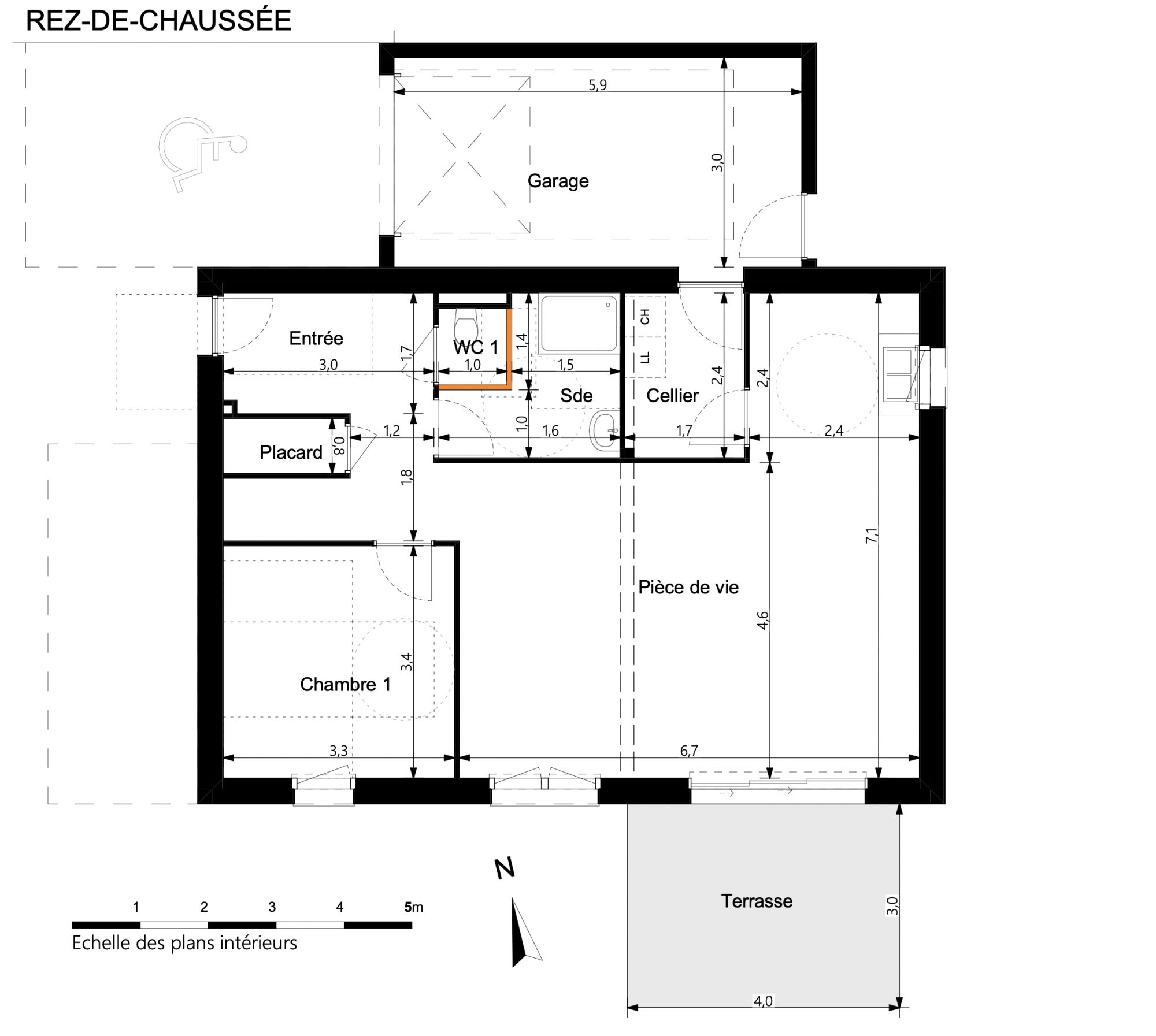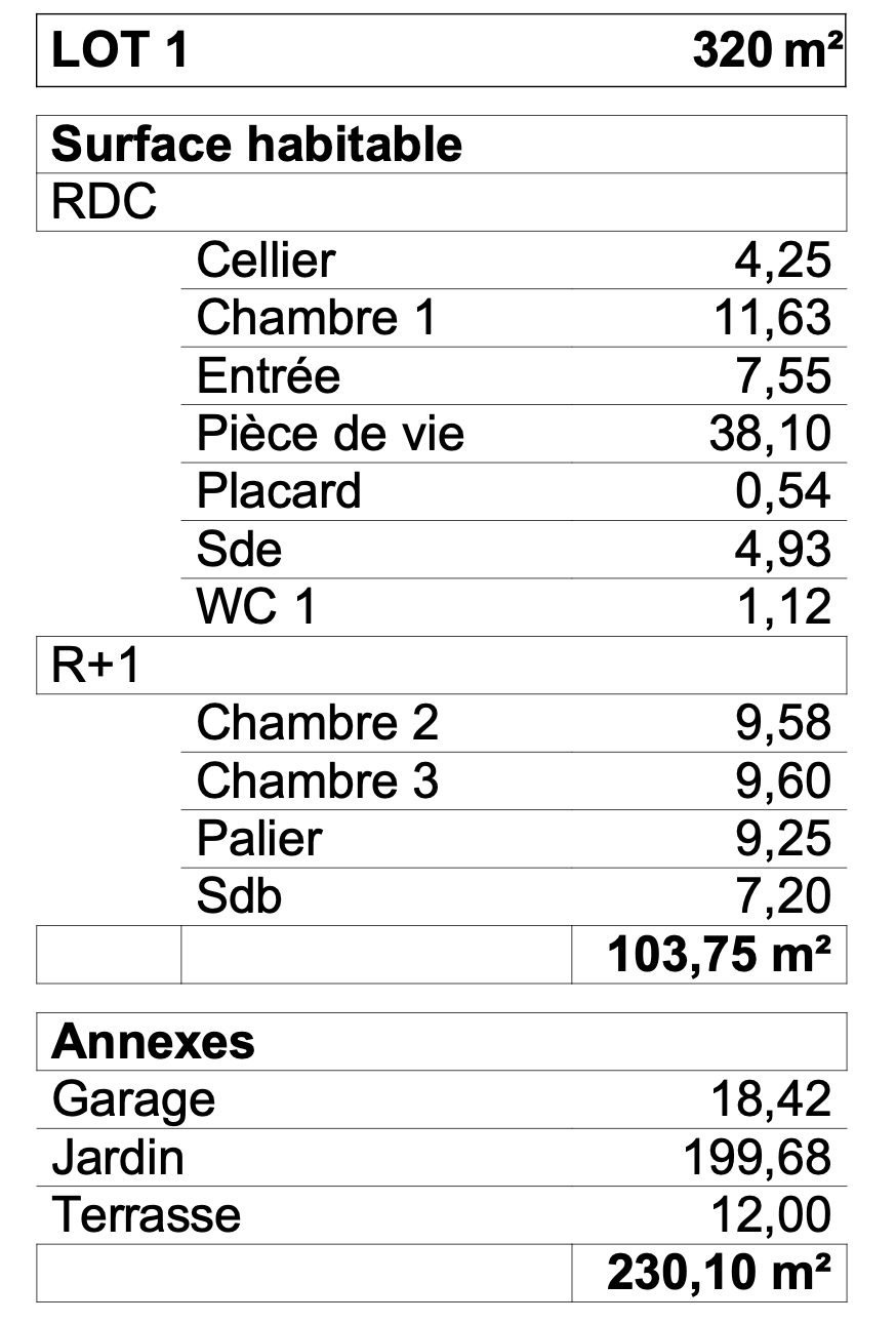 - Au rez de chaussée : Séjour 38m2, Chambre 11,63m2, salle d'eau, wc séparés, cellier, entrée, placards, terrasse, garage, jardin