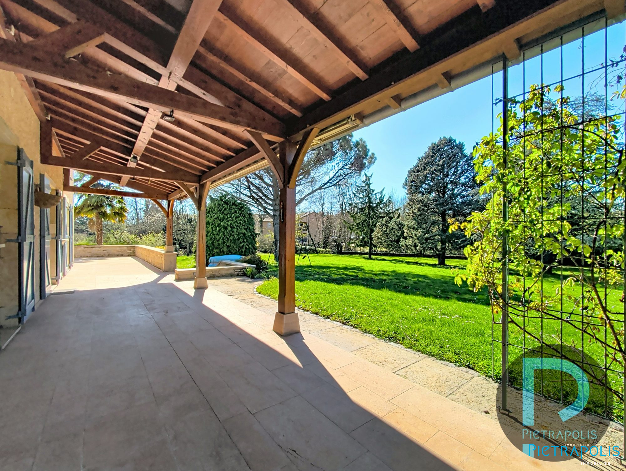 Un beau parc arboré clos de 3547 m² avec un magnifique porche en pierre à l' entrée, grand portail en bois.