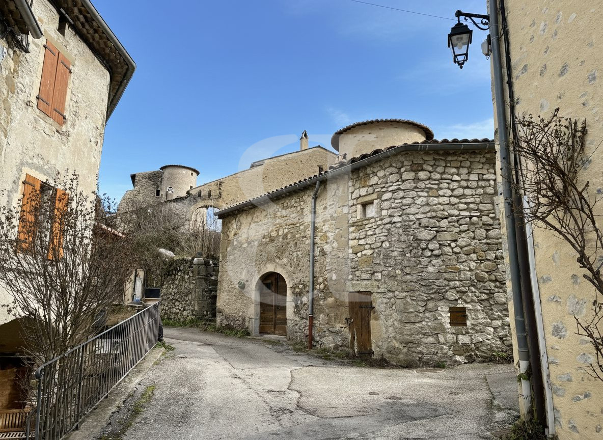 Maison de village en pierre de 1780 à rénover à vendre région Nyons, dans village classé en limite des départements de la Drôme et des Hautes Alpes. Très beaux sols en pierre et carrelage ciment d'époque. 3 caves. Petite terrasse couverte.