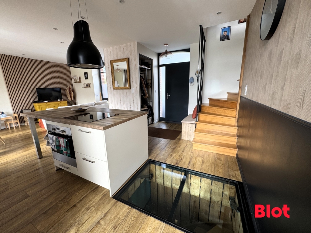 Dès l'entrée, vous découvrez une pièce de vie chaleureuse et lumineuse avec vue sur le jardin, une cuisine ouverte aménagée et équipée ainsi qu'un accès original au sous-sol par trappe vitrée motorisée intégrée au sol, pratique au quotidien.