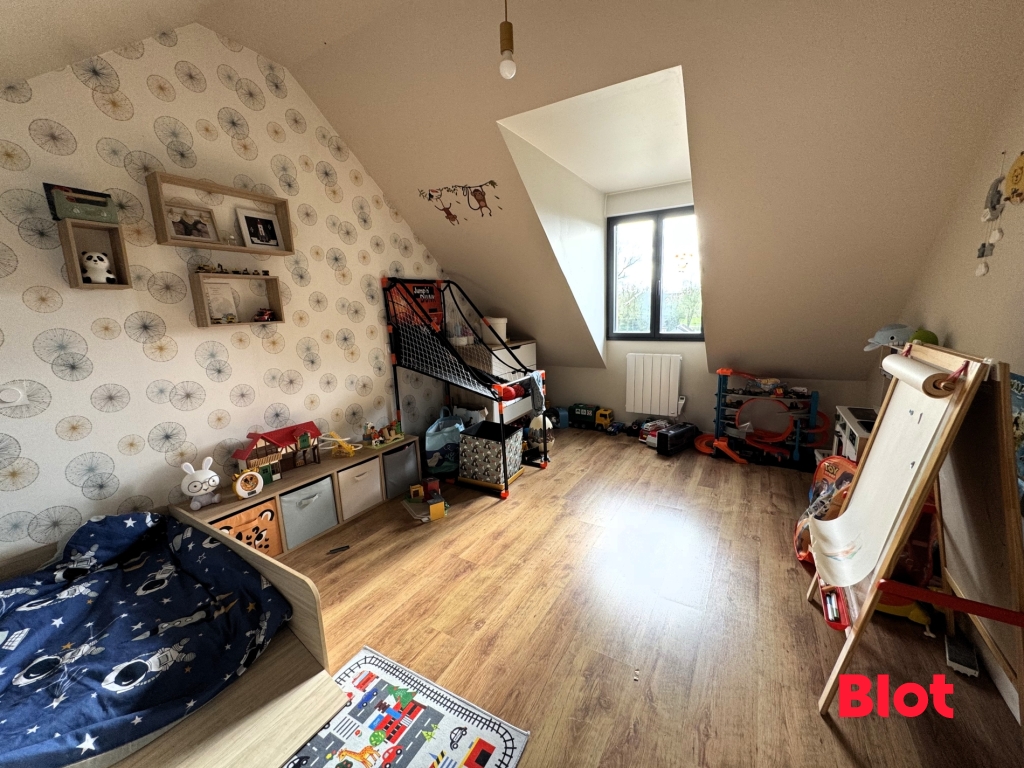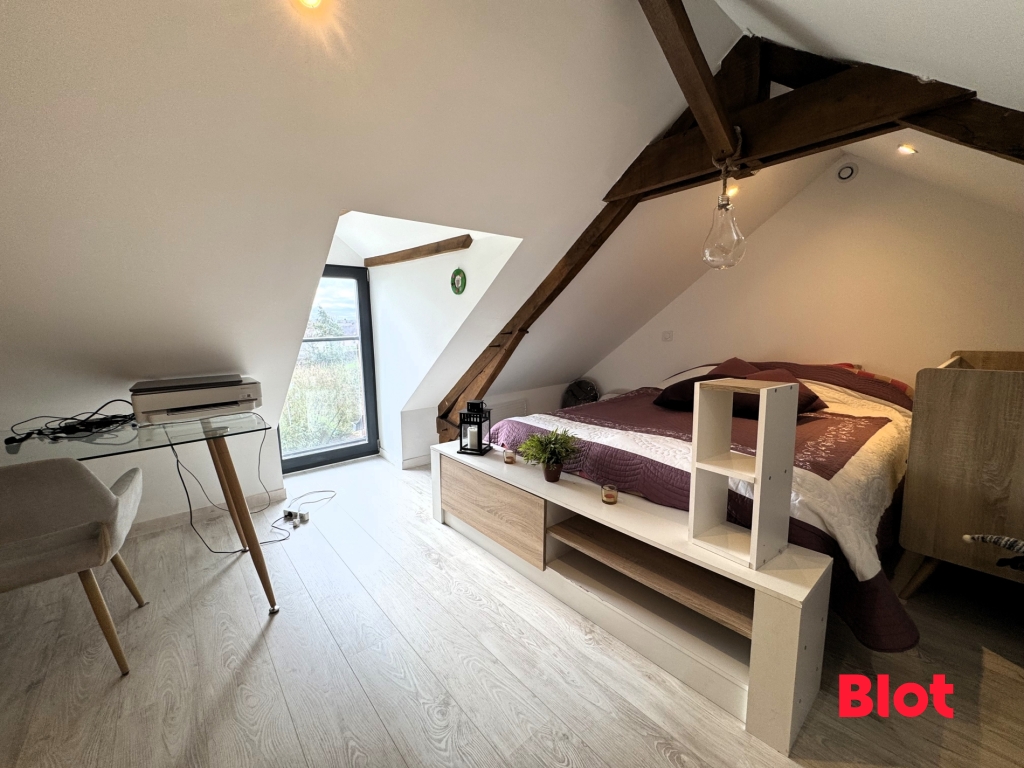Au dernier étage, une grande chambre aménagée dans les combles offre un bel espace cosy.