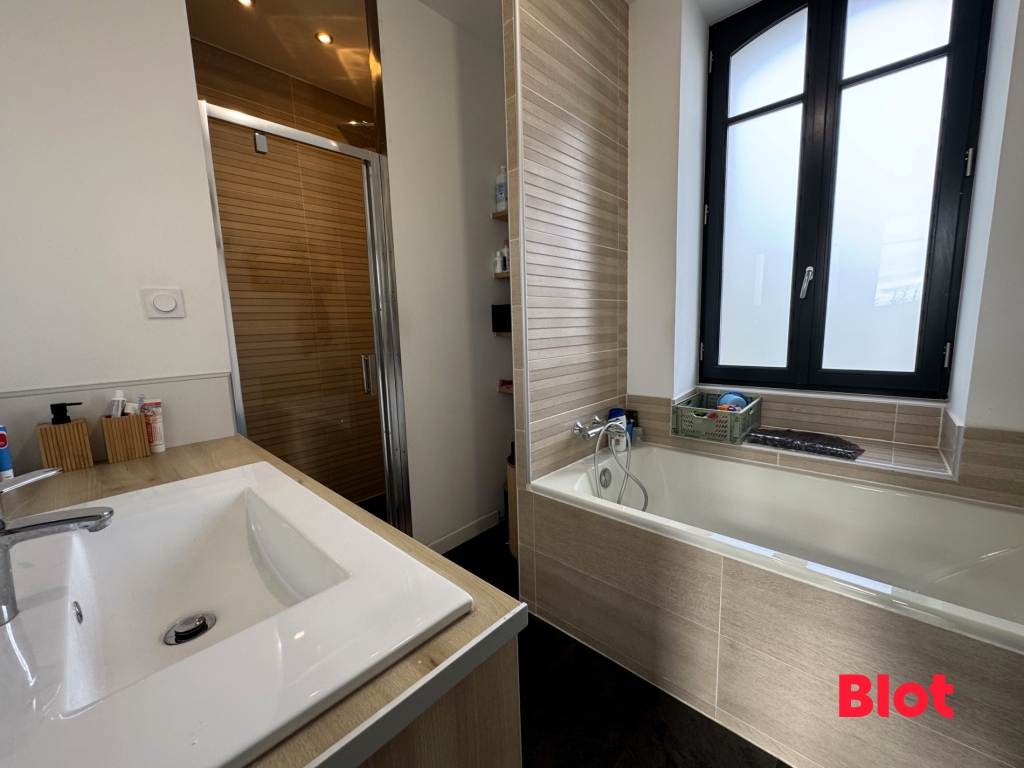 Au premier étage, une mezzanine lumineuse dessert deux chambres dont une avec dressing, une salle de bains avec douche et baignoire ainsi que des WC séparés.
