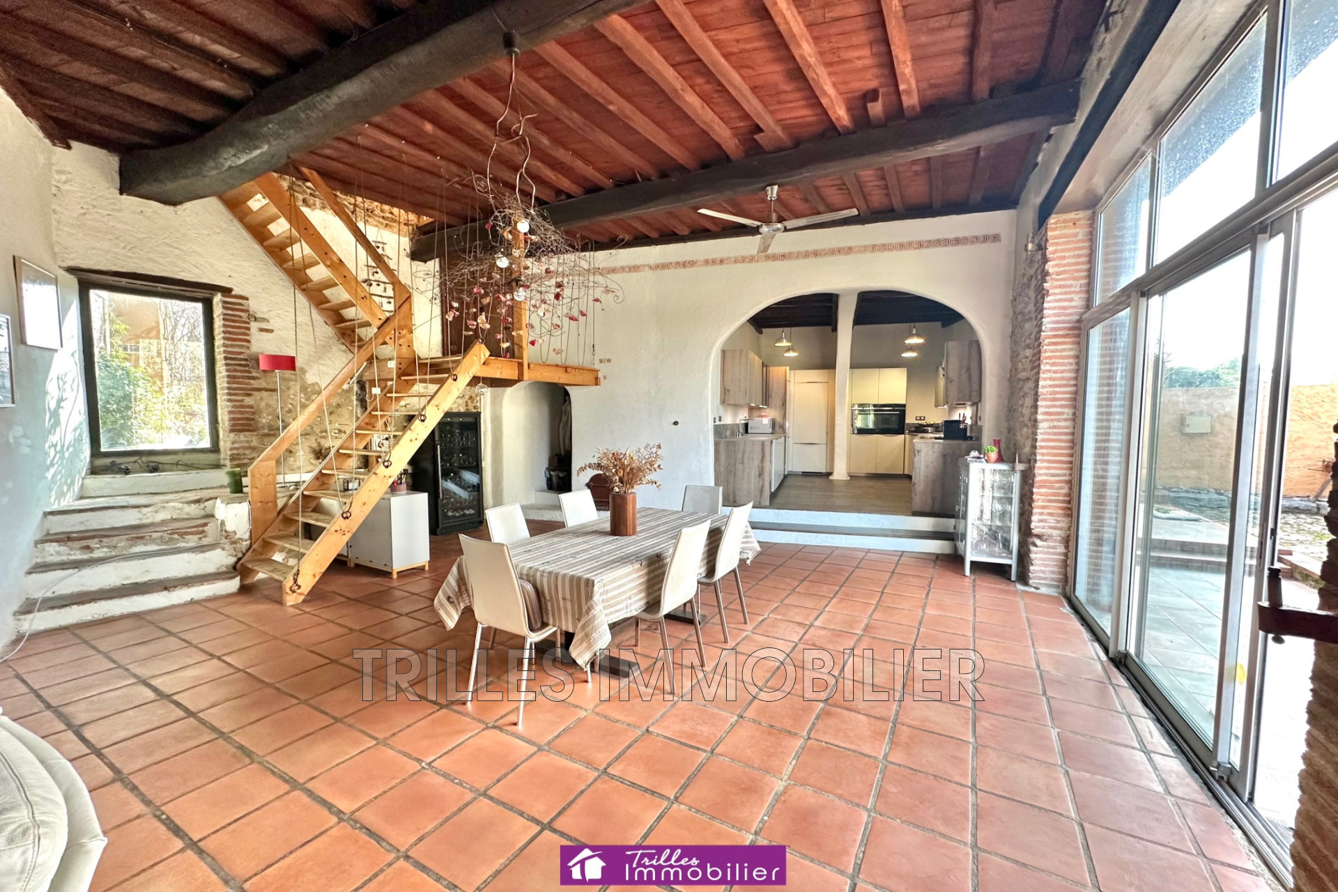 Au rez-de-chaussée, vous découvrirez magnifique et grande pièce de vie ouverte sur une belle cuisine entièrement équipée, le tout sublimé par des murs en pierre apparente et de superbes poutres d'origine.
