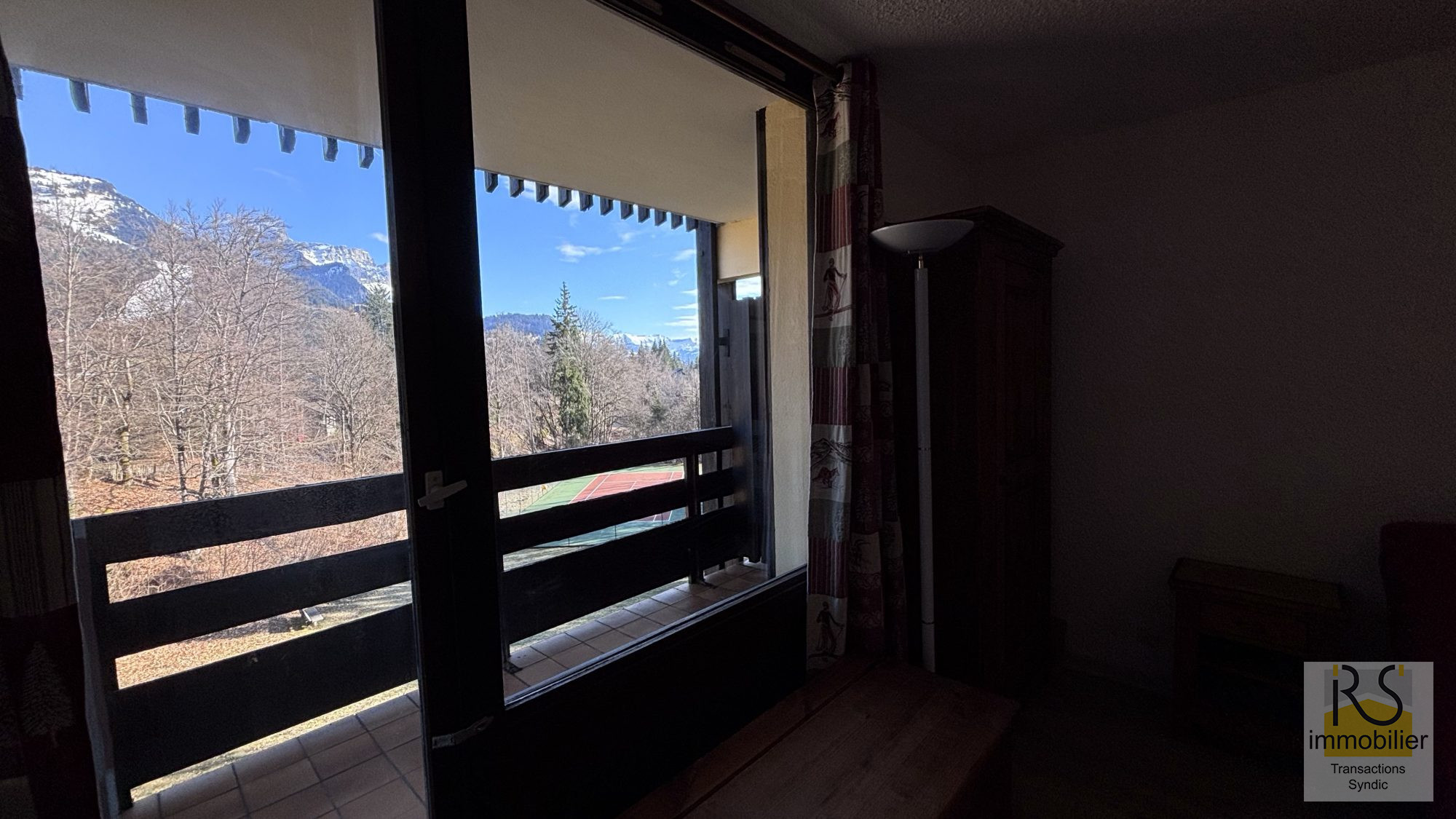 La pièce de vie est séparée par une porte et comprend une kitchenette ainsi qu'un accès direct à un balcon exposé sud-est, offrant une belle vue sur les montagnes.
