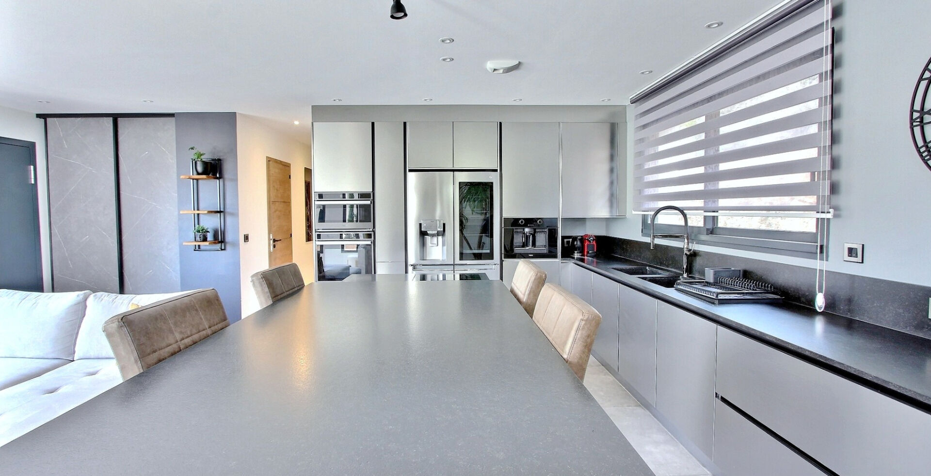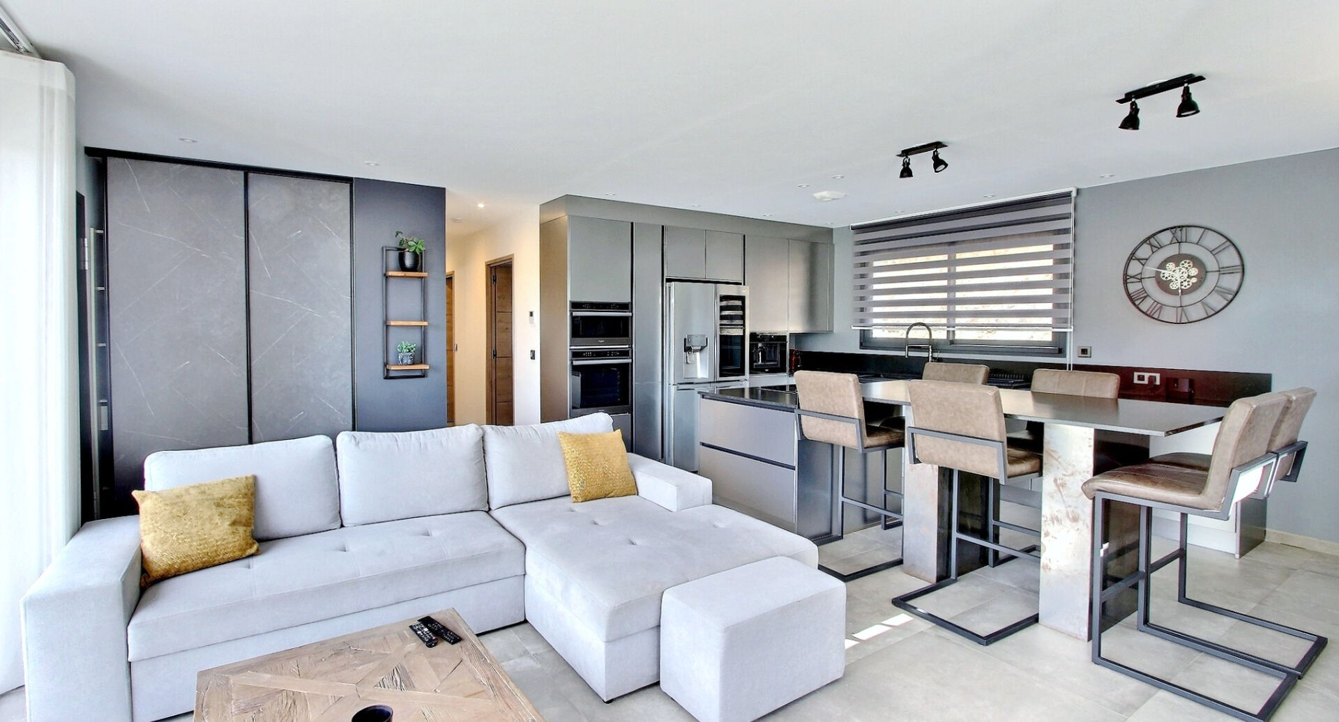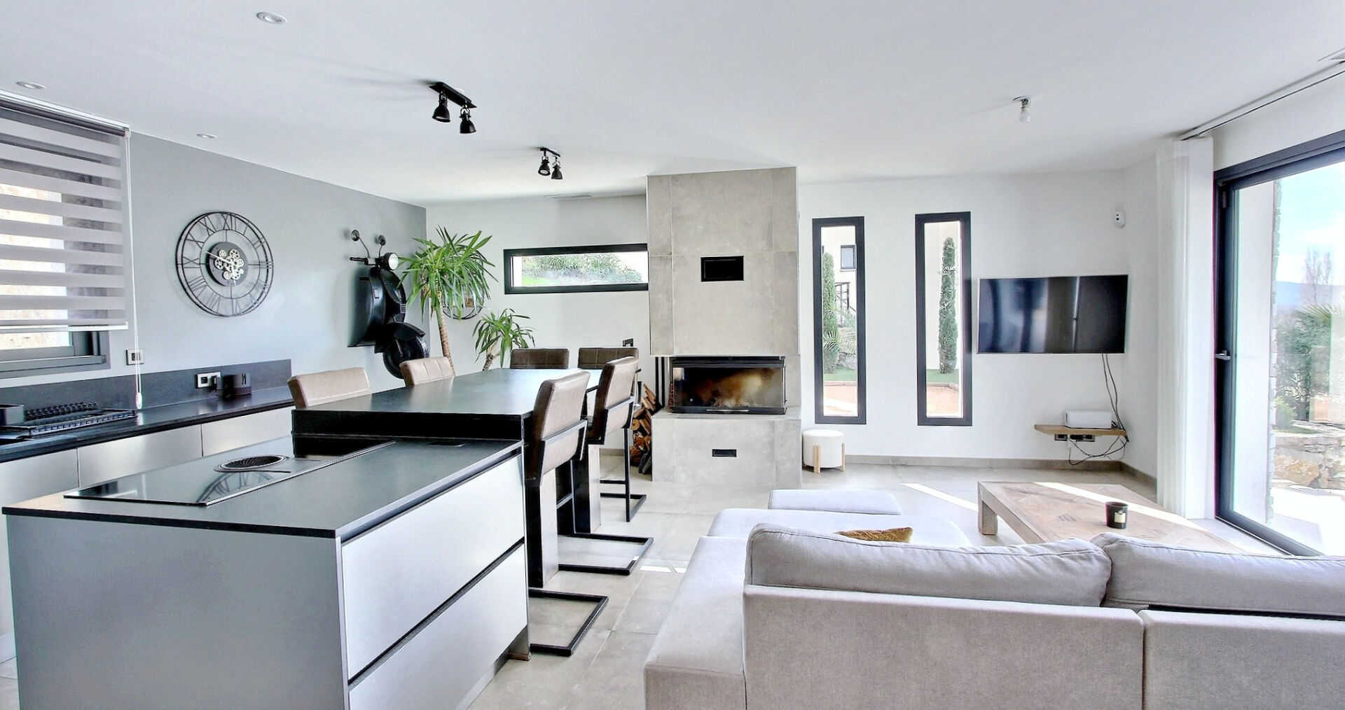 Dès l'arrivée, l'architecture séduit par sa façade claire et ses larges ouvertures panoramiques en aluminium, baignées de lumière. À l'intérieur, la pièce de vie impressionne par son atmosphère résolument design, sublimée par une cheminée en béton minéral et une superbe cuisine dinatoire de chef en inox, entièrement équipée, pensée pour les amateurs de gastronomie et de convivialité.