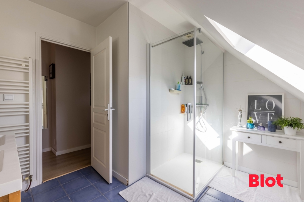 À l'étage, un dégagement dessert trois chambres confortables, chacune équipée de placards intégrés. Vous y trouverez également une salle d'eau récemment rénovée, un WC séparé et un grenier offrant un beau potentiel d'aménagement, pouvant devenir une cinquième chambre, un bureau ou un espace loisirs selon vos besoins.
