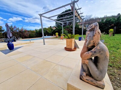 Dans le quartier du stade de Prades, une villa de caractère (année 1994) de bonne construction, très lumineuse avec de beaux volumes, composée de 6 chambres dont 1 au rdc, d'une surface habitable de 209.57m² avec un grand garage, piscine chauffée et un agréable jardin clos et arboré de 1 725m².